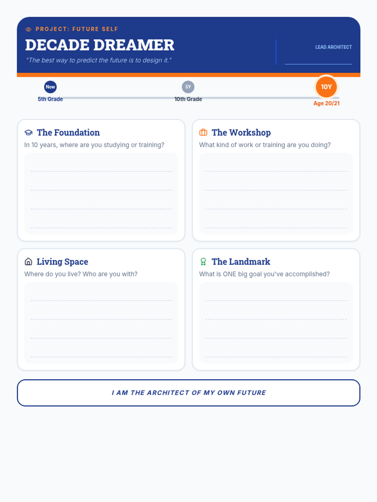 A 10-year vision mapping worksheet for students to project their future education, career, living situation, and personal goals. Uses a 'Decade Dreamer' theme with structured planning areas.