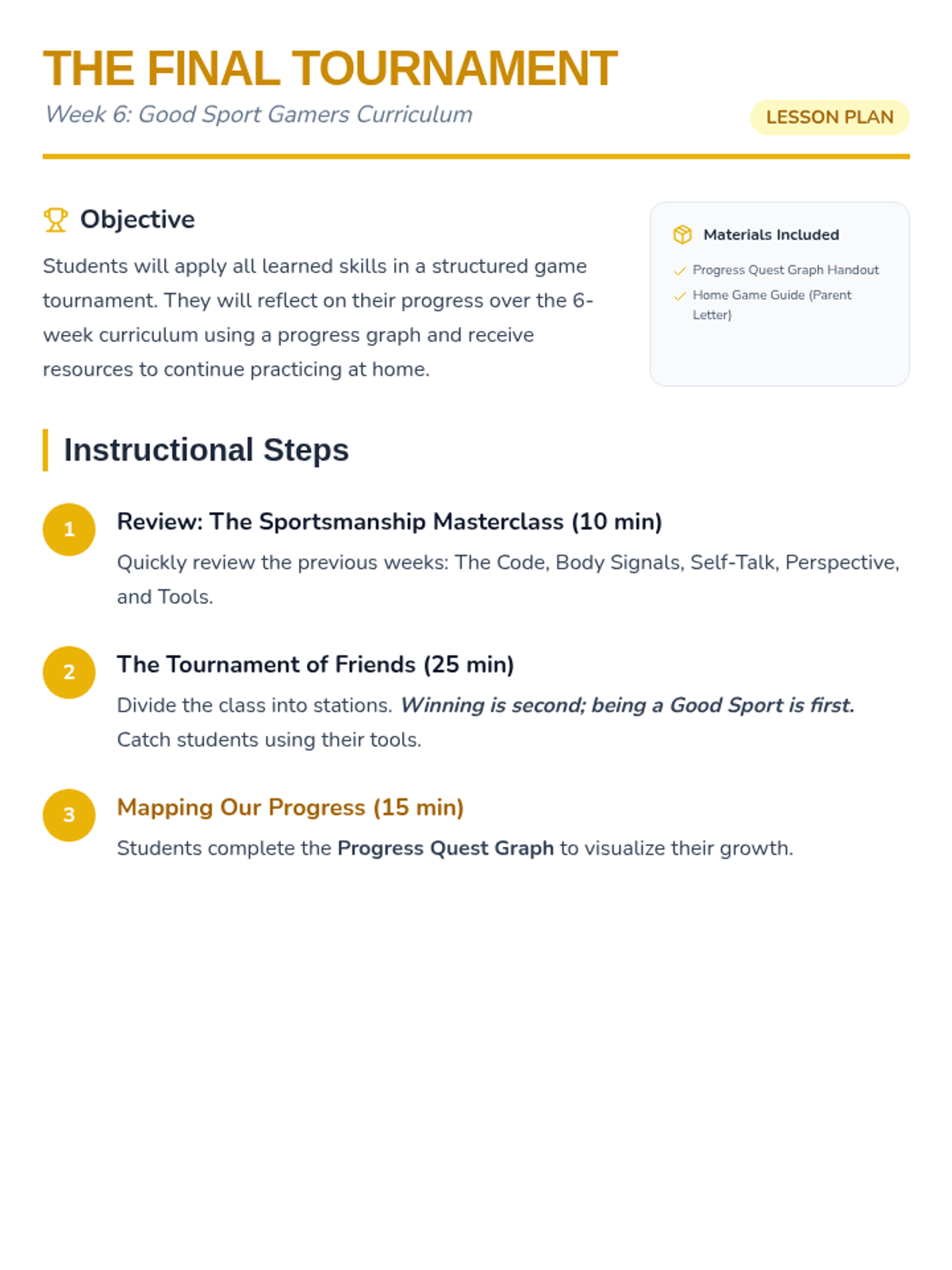 Lesson plan, progress quest graph, and parent handout for the final week, adjusted for 30-minute session pacing.