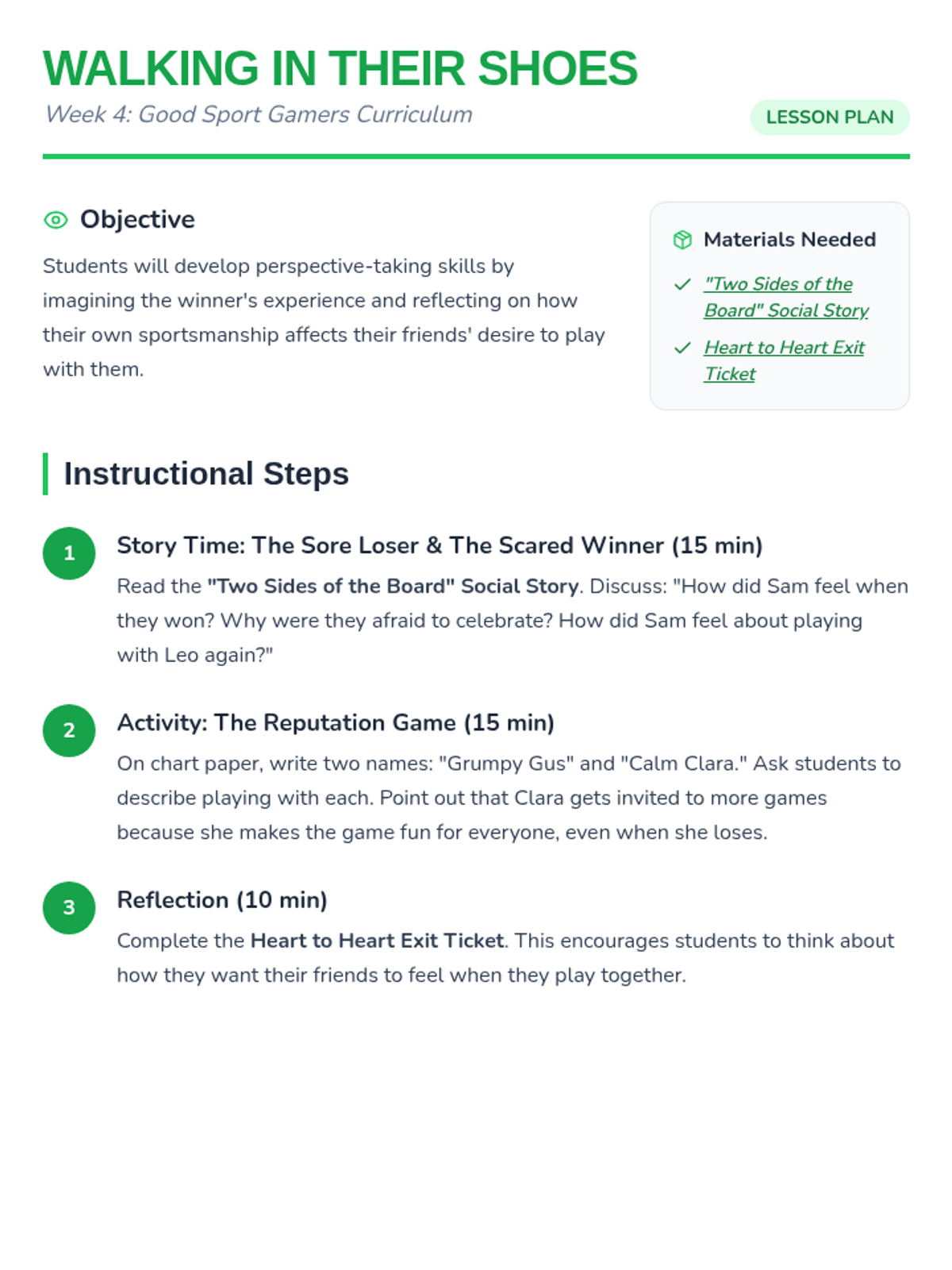 Lesson plan, social story, and exit ticket for Week 4, adjusted for 30-minute session pacing.