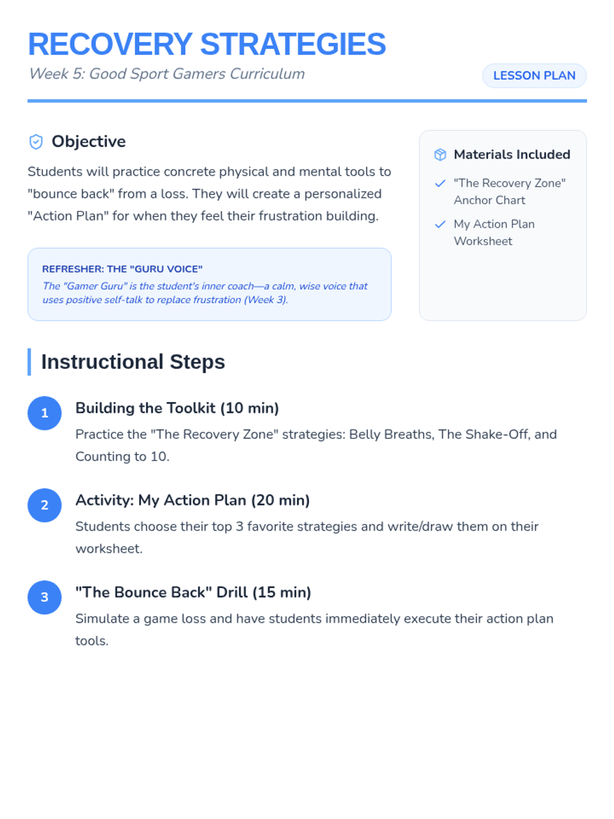 Lesson plan, recovery tools anchor chart, and action plan worksheet for Week 5, adjusted for 30-minute session pacing.