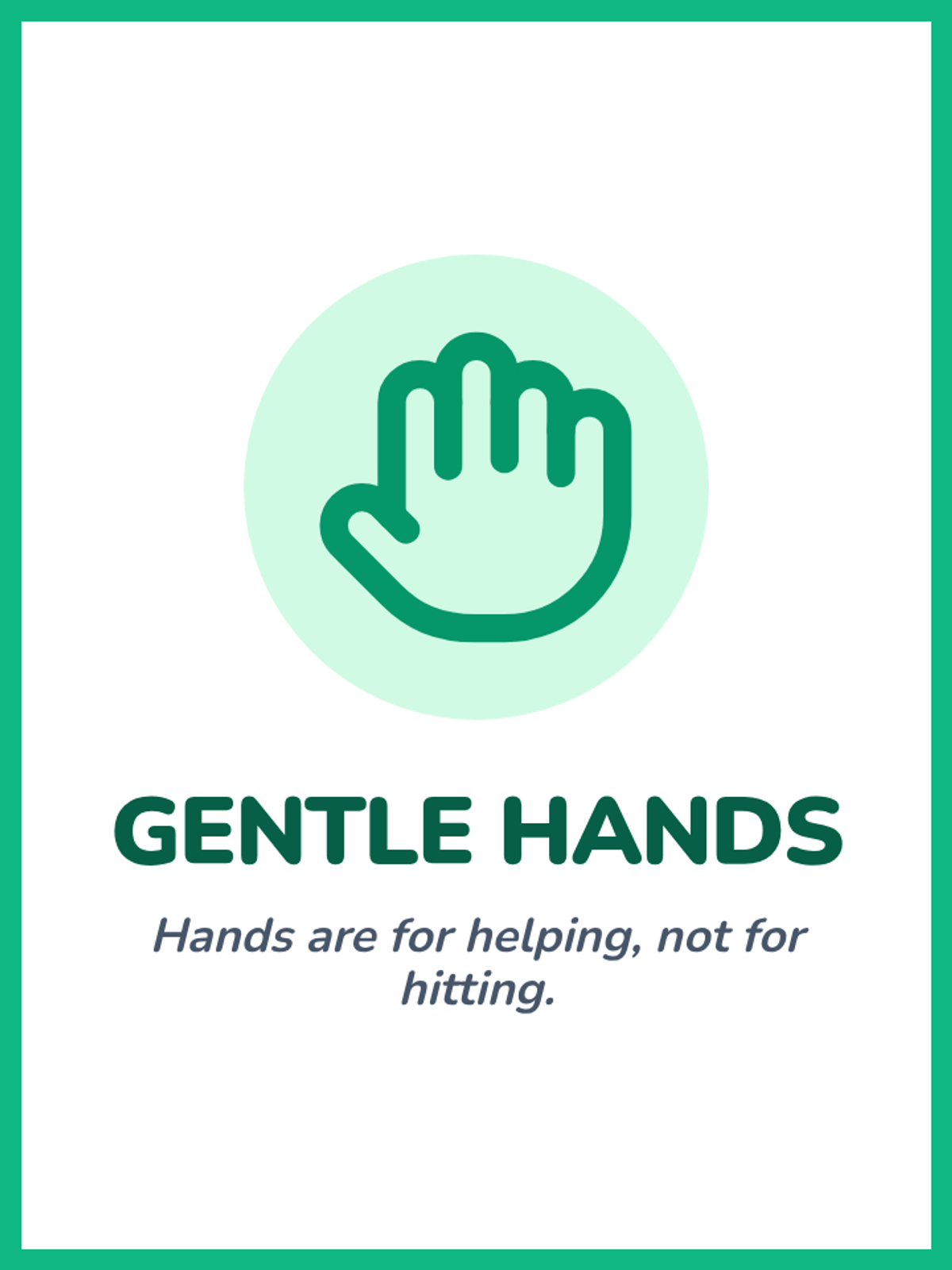 A simple social story with large visuals and clear text explaining that hitting hurts and hands are for helping. Each page is a full-size panel for easy reading and binding.