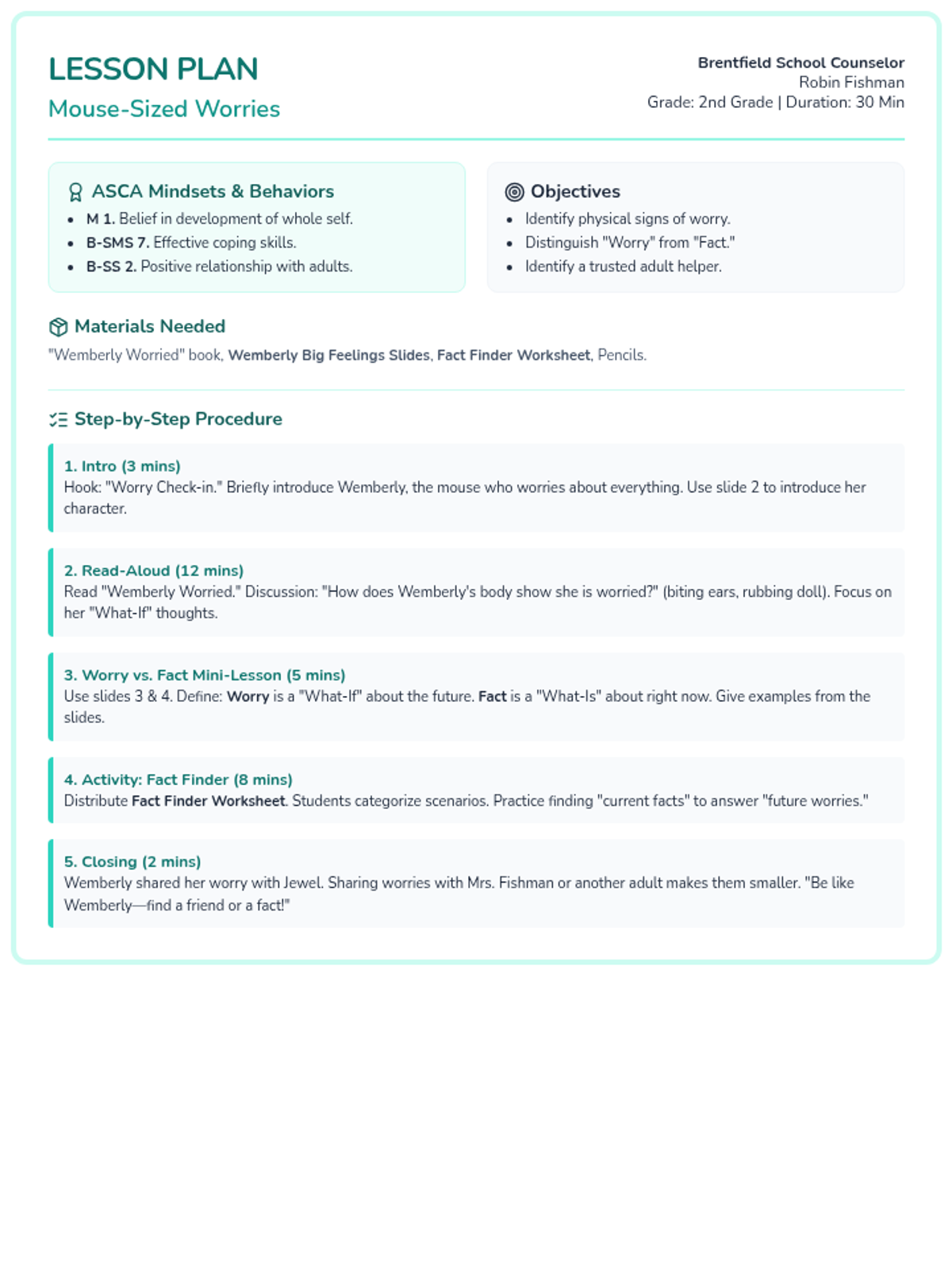 A comprehensive lesson plan for school counselors focusing on identifying and managing worry using the book 'Wemberly Worried'. Includes ASCA alignment and procedural steps for a 30-minute session.