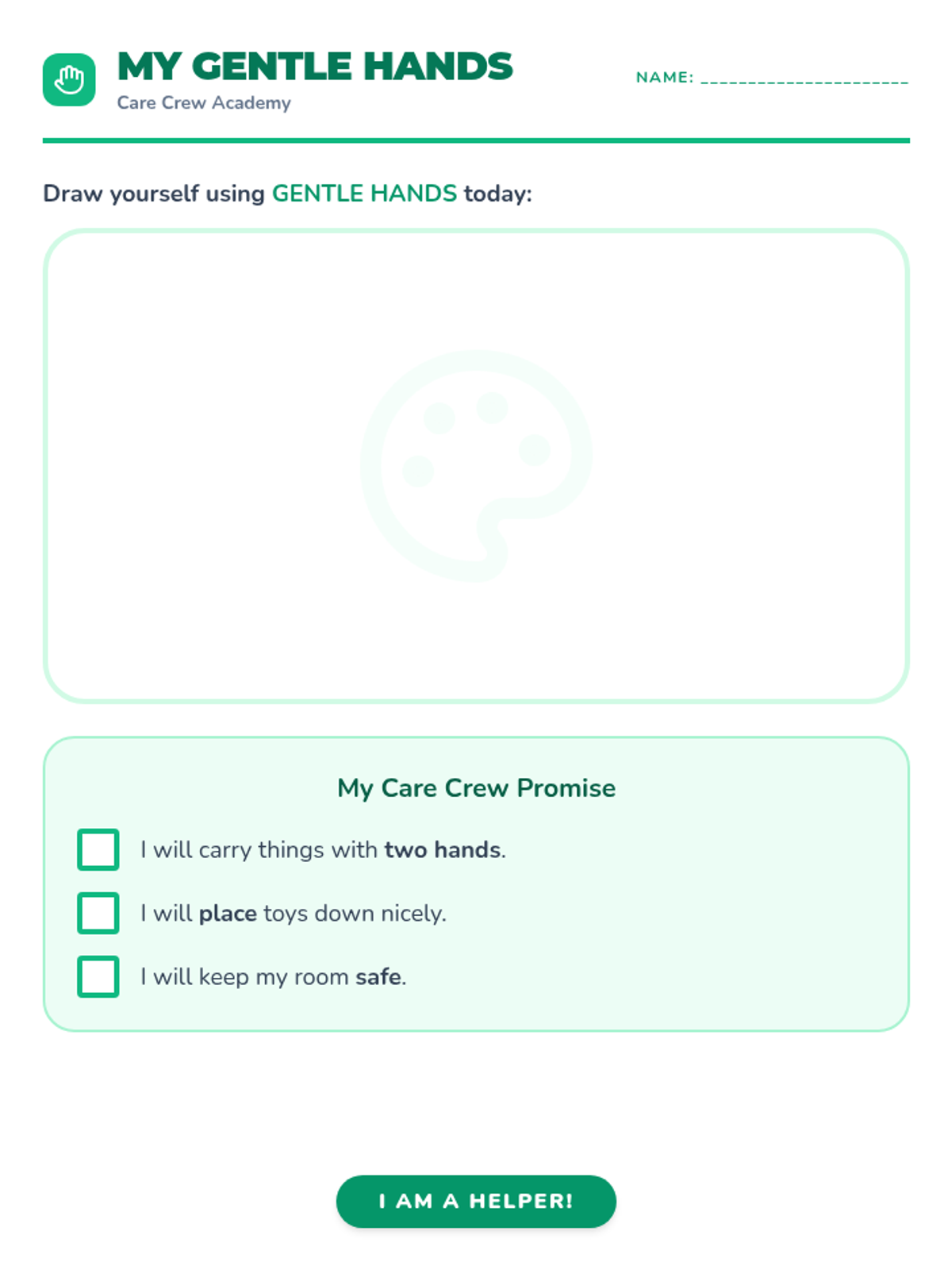 A reflection worksheet for K-1 students where they draw themselves using gentle hands and check off their Care Crew promises. Optimized to fit on a single page with a balanced layout.
