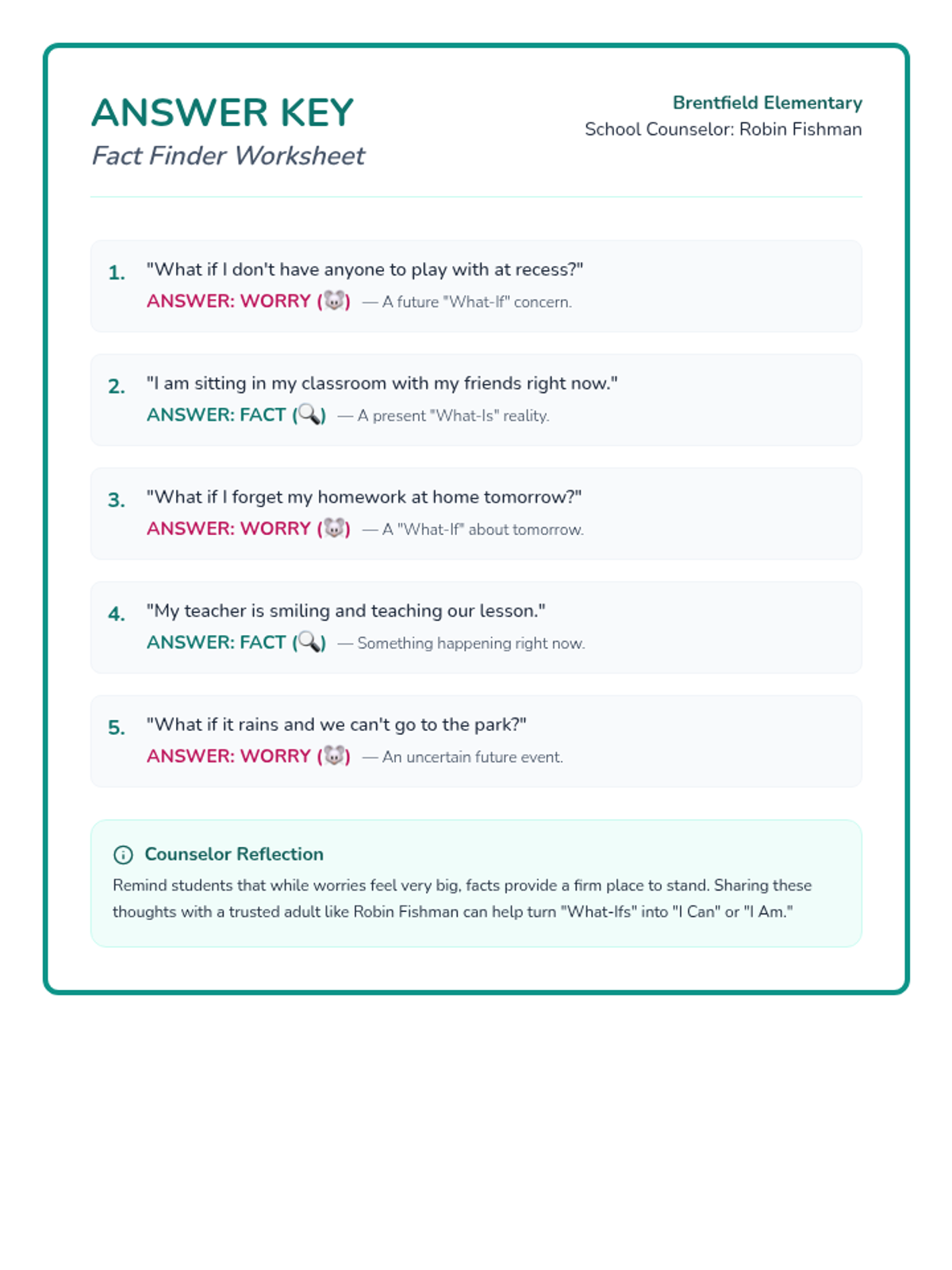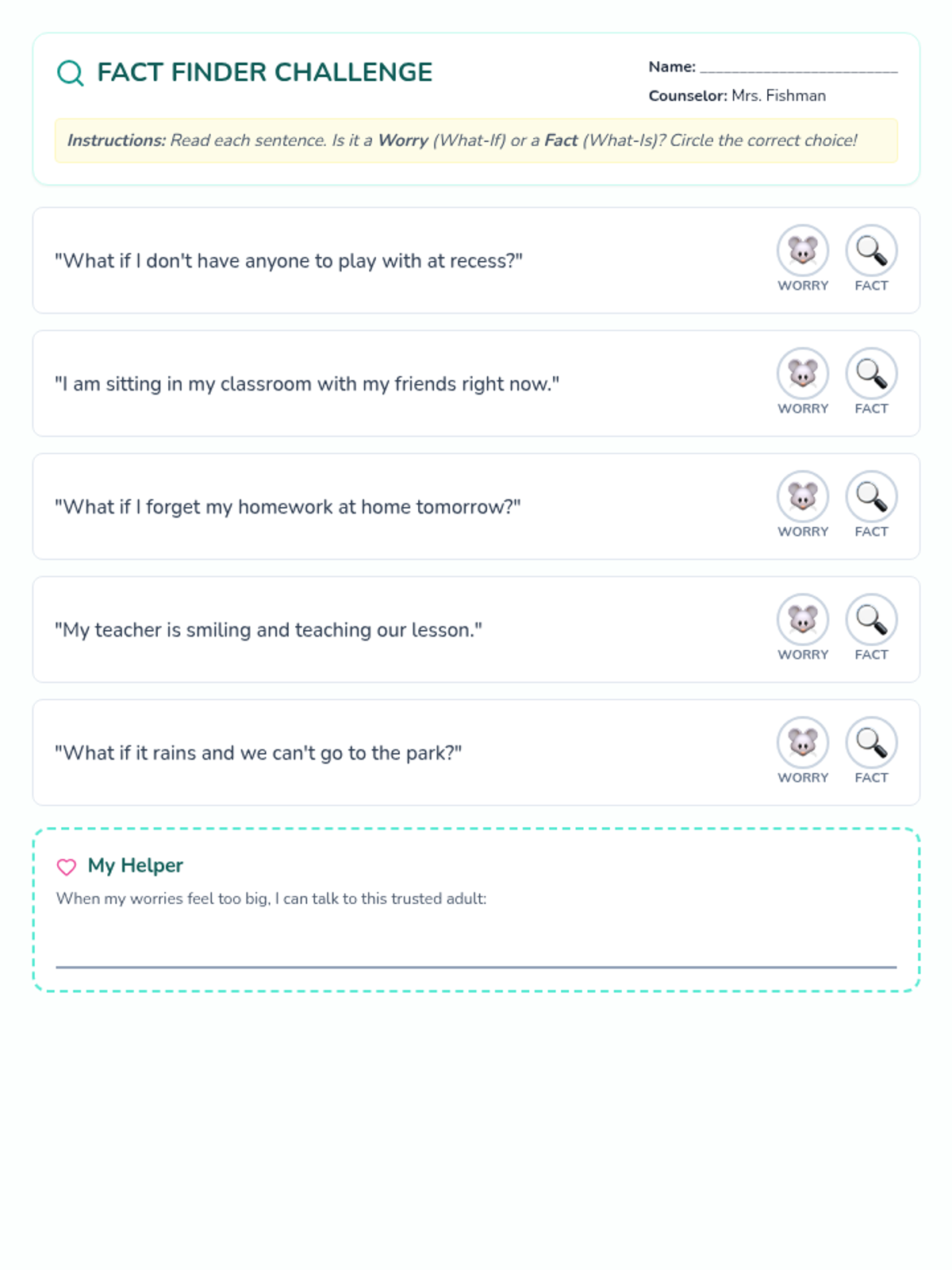 A student worksheet where 2nd graders identify statements as 'Worry' (What-Ifs) or 'Fact' (What-Is), inspired by Wemberly Worried.