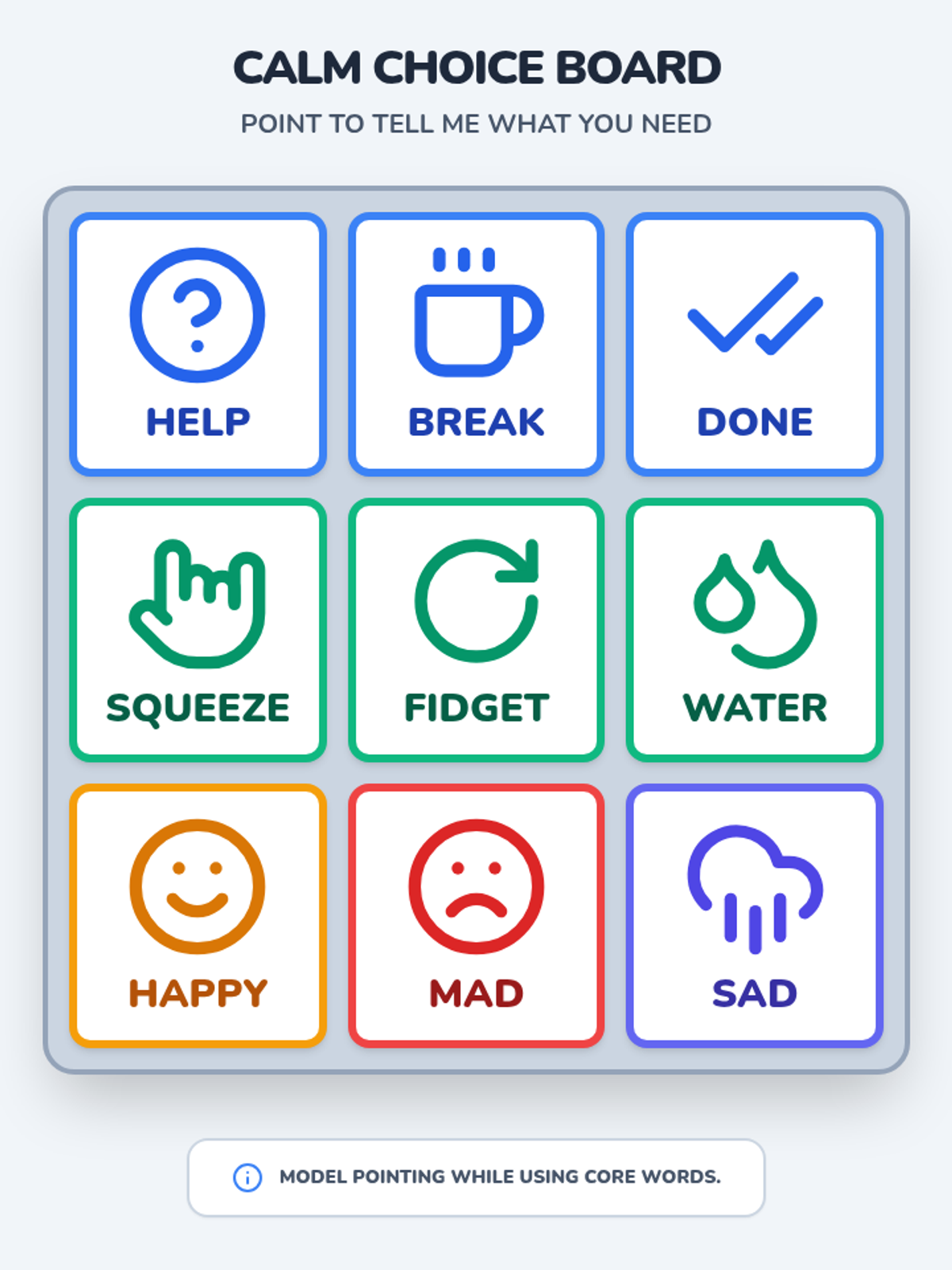 A high-contrast visual communication board with core icons for needs, emotions, and sensory regulation tools, optimized for accessibility.