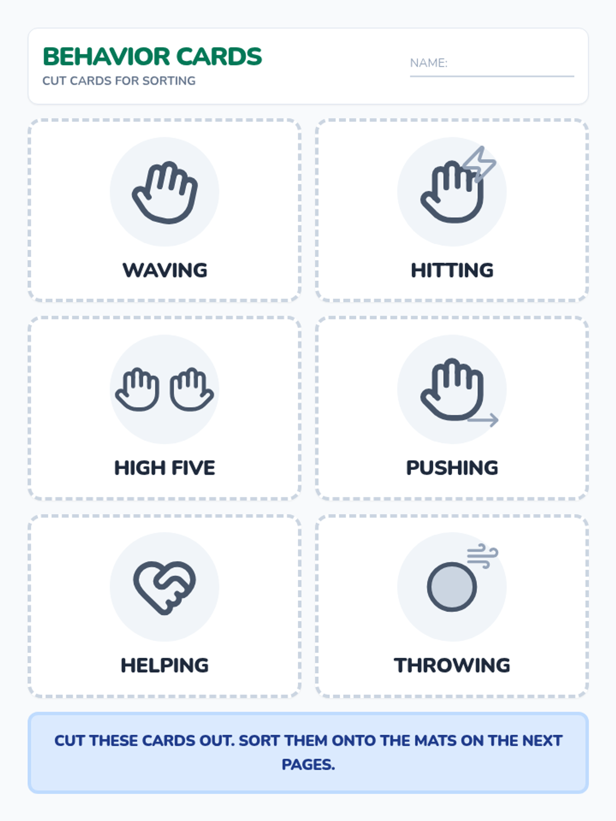 A multi-page sorting activity with large visual cards and dedicated full-page sorting mats for safe vs. unsafe hand behaviors. Optimized for 8.5x11 printing with ample space for high-needs students.