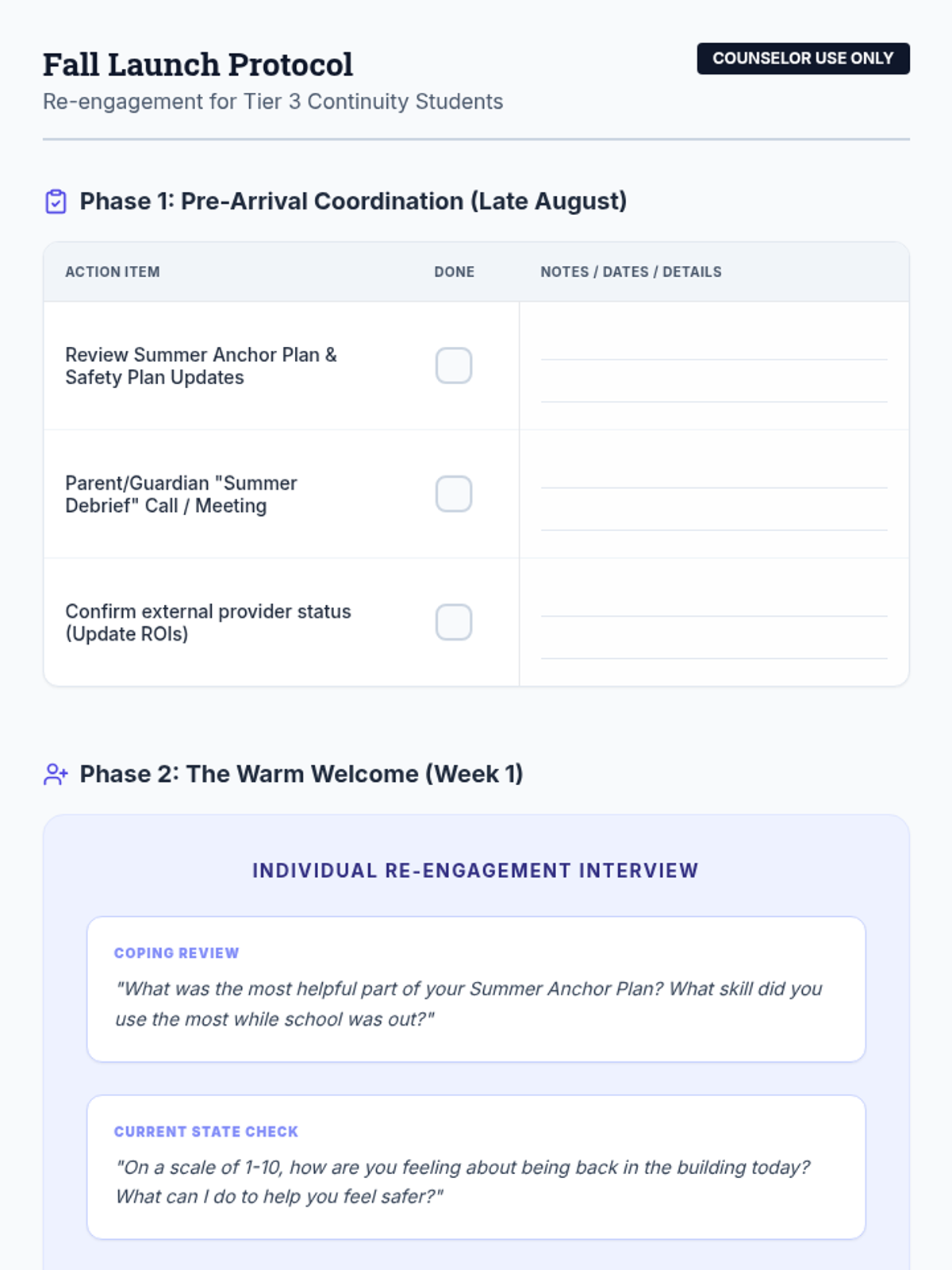 A teacher/counselor-facing protocol for re-engaging Tier 3 students in the fall, including transition checklists, debriefing prompts, and long-term planning steps. Improved spacing and handwriting areas.