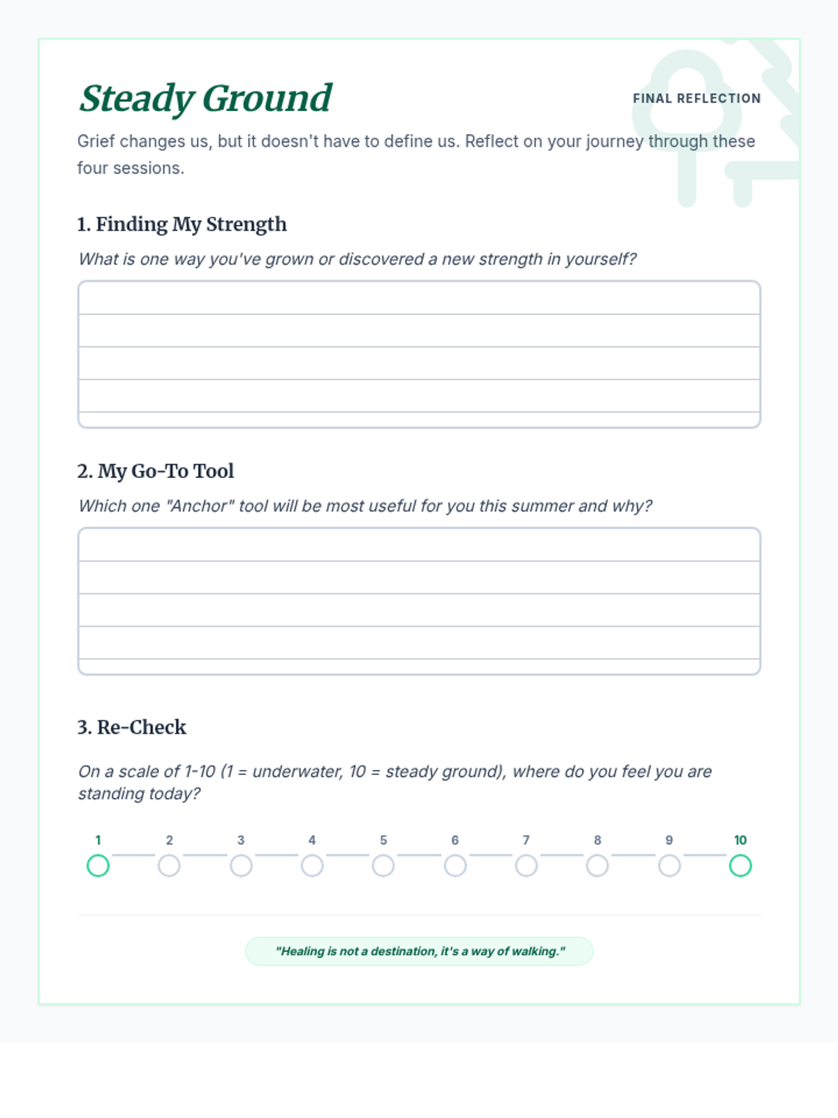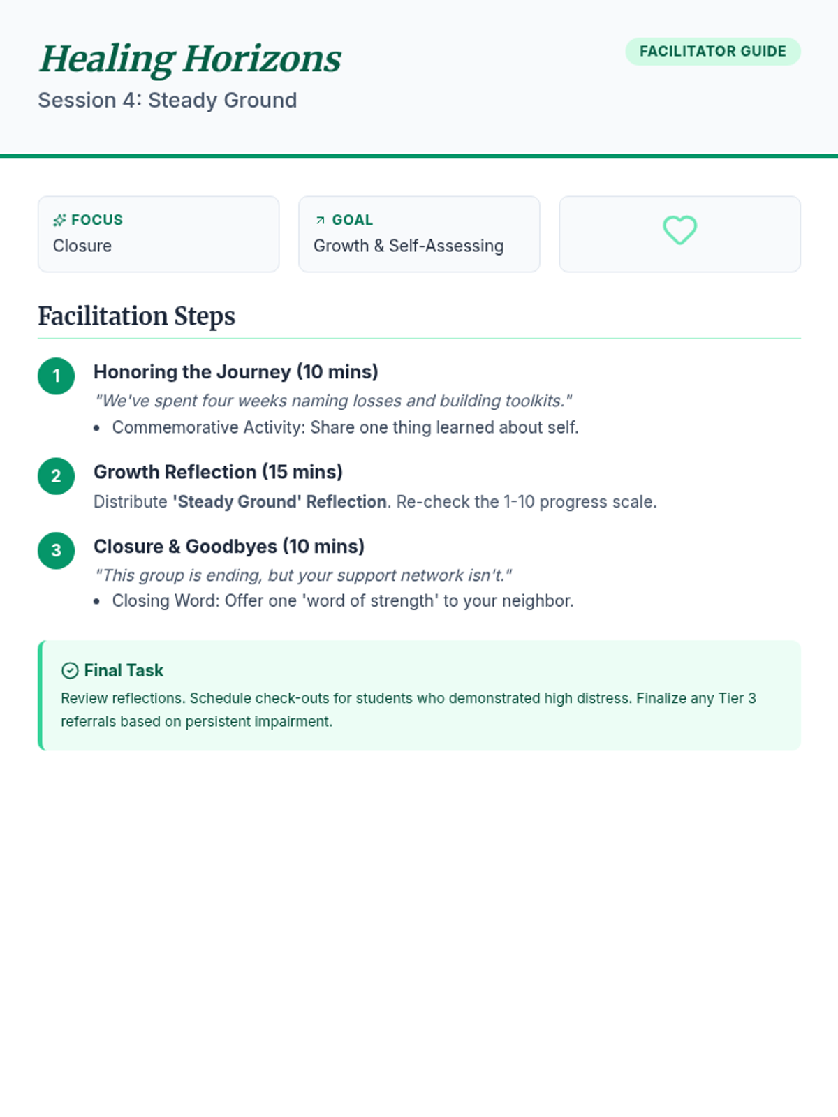 A facilitation guide for the final group session focusing on growth and closure. Revised for a single-page layout.