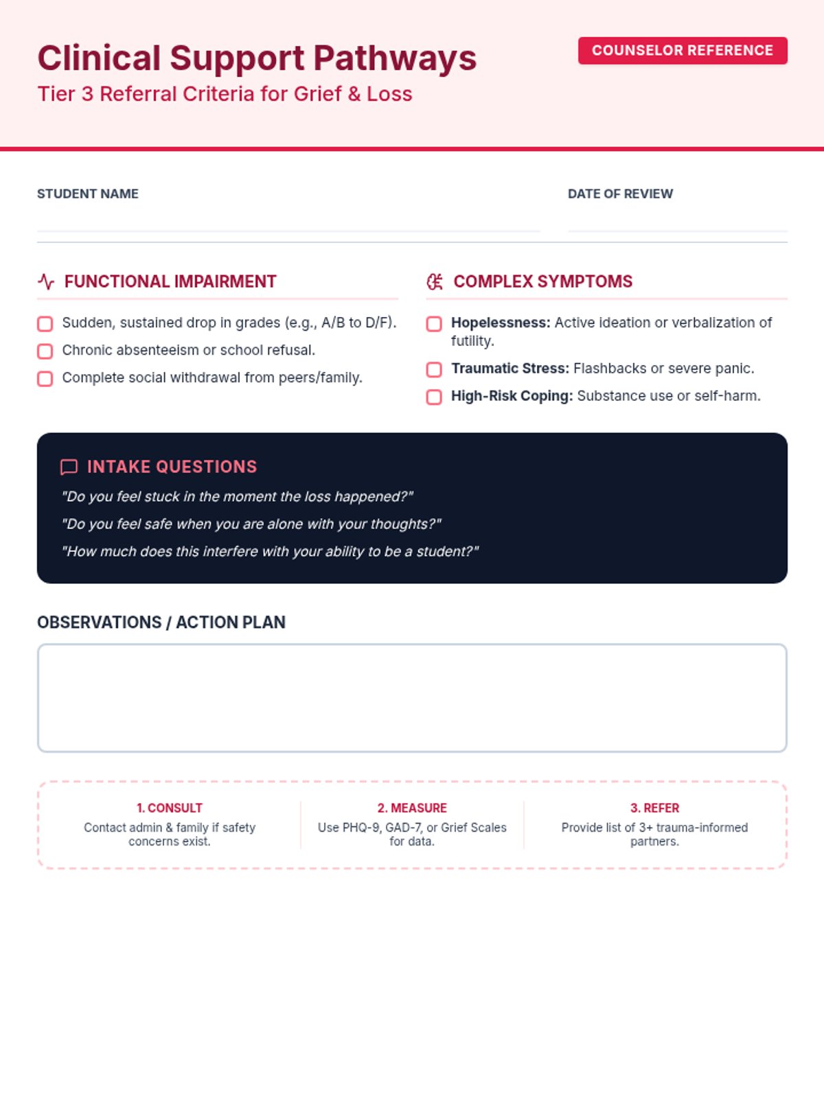 A clinical reference guide for counselors to identify Tier 3 needs. Revised for single-page layout, includes header fields, and improved contrast.