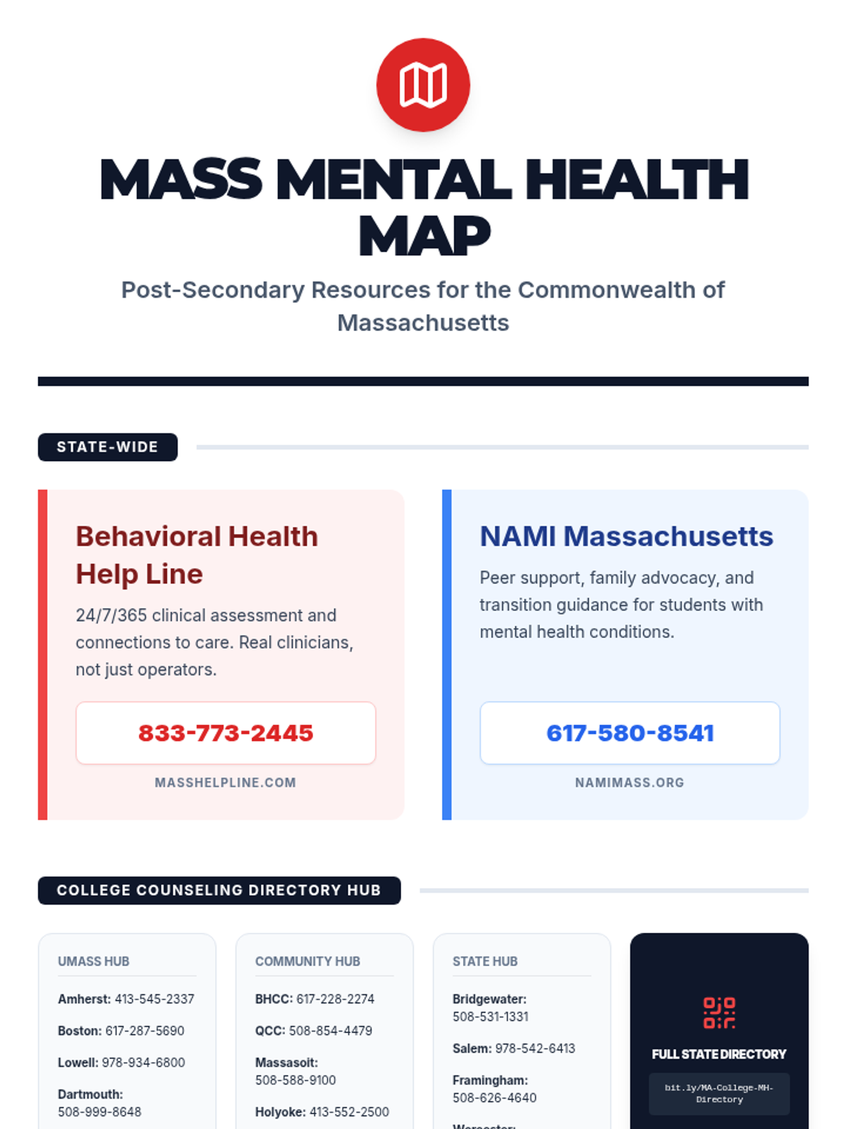 A curated resource sheet for Massachusetts-specific mental health services, including college counseling center contacts, state-wide hotlines, and regional community health centers.