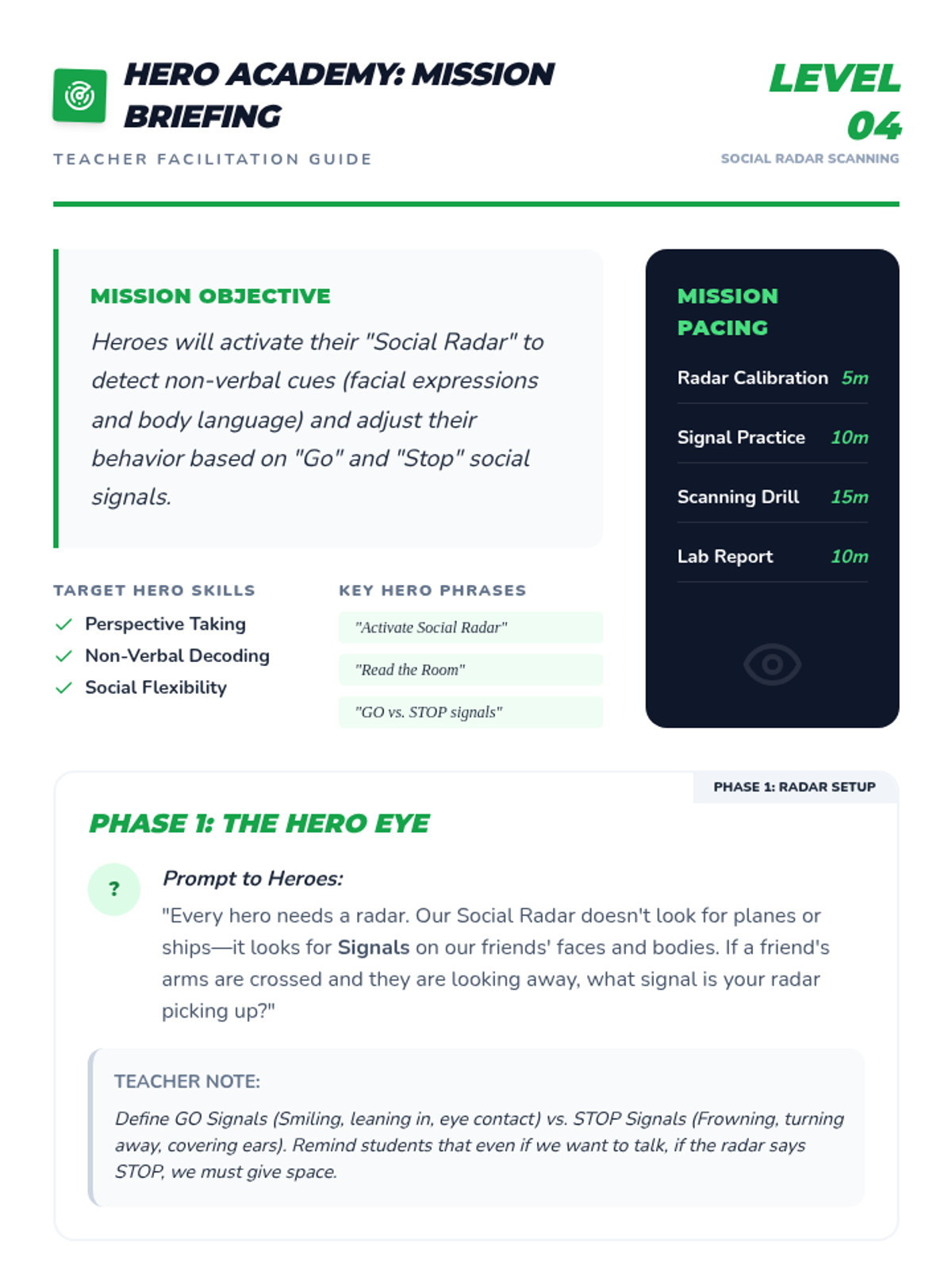 Teacher facilitation guide for Lesson 4: Social Radar Scanning. Includes instructional scripts for detecting non-verbal social signals, radar calibration drills, and perspective-taking strategies.