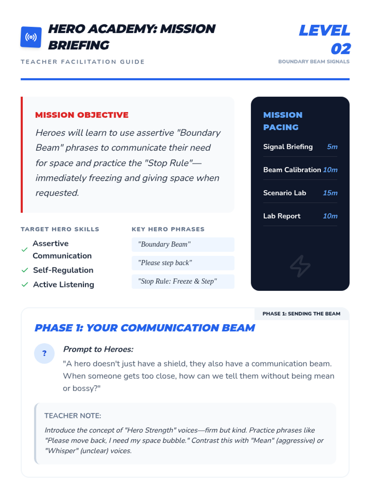 Teacher facilitation guide for Lesson 2: Boundary Beam Signals. Includes instructional scripts for teaching assertive communication, roleplay scenarios, and strategies for implementing the "Stop Rule" in the classroom.