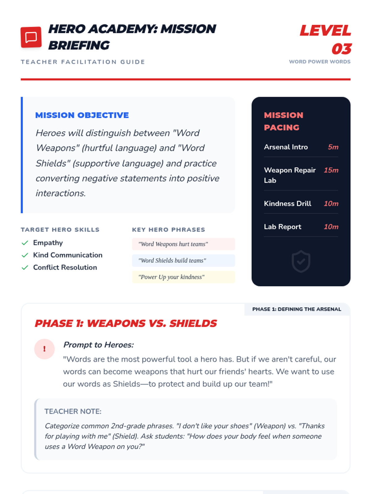 Teacher facilitation guide for Lesson 3: Word Power Words. Provides strategies for distinguishing between helpful and hurtful language, scripted repair missions for social errors, and peer-support techniques.