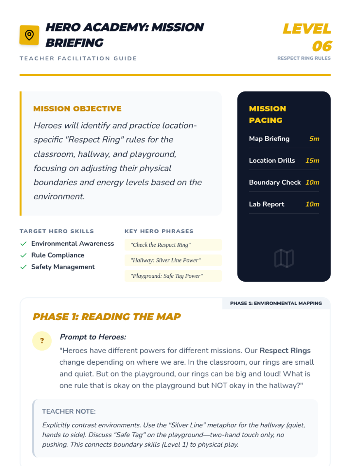 Teacher facilitation guide for Lesson 6: Respect Ring Rules. Includes instructional scripts for detecting non-verbal social signals, radar calibration drills, and perspective-taking strategies focused on school-wide environments.