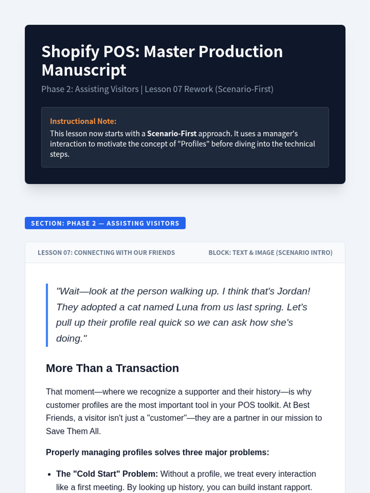 The updated Master Manuscript with a reworked Lesson 07. It consolidates profile management into a single, instructionally sound lesson that motivates the learner by explaining the impact of accurate data on building relationships and supporting the Best Friends mission.