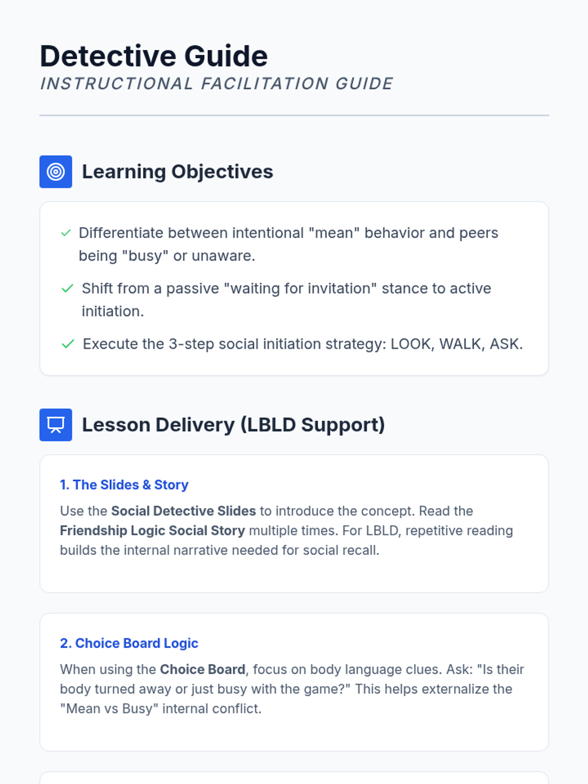 A teacher's guide providing instructional strategies, vocabulary, and implementation tips for teaching social detective skills to students with LBLD.