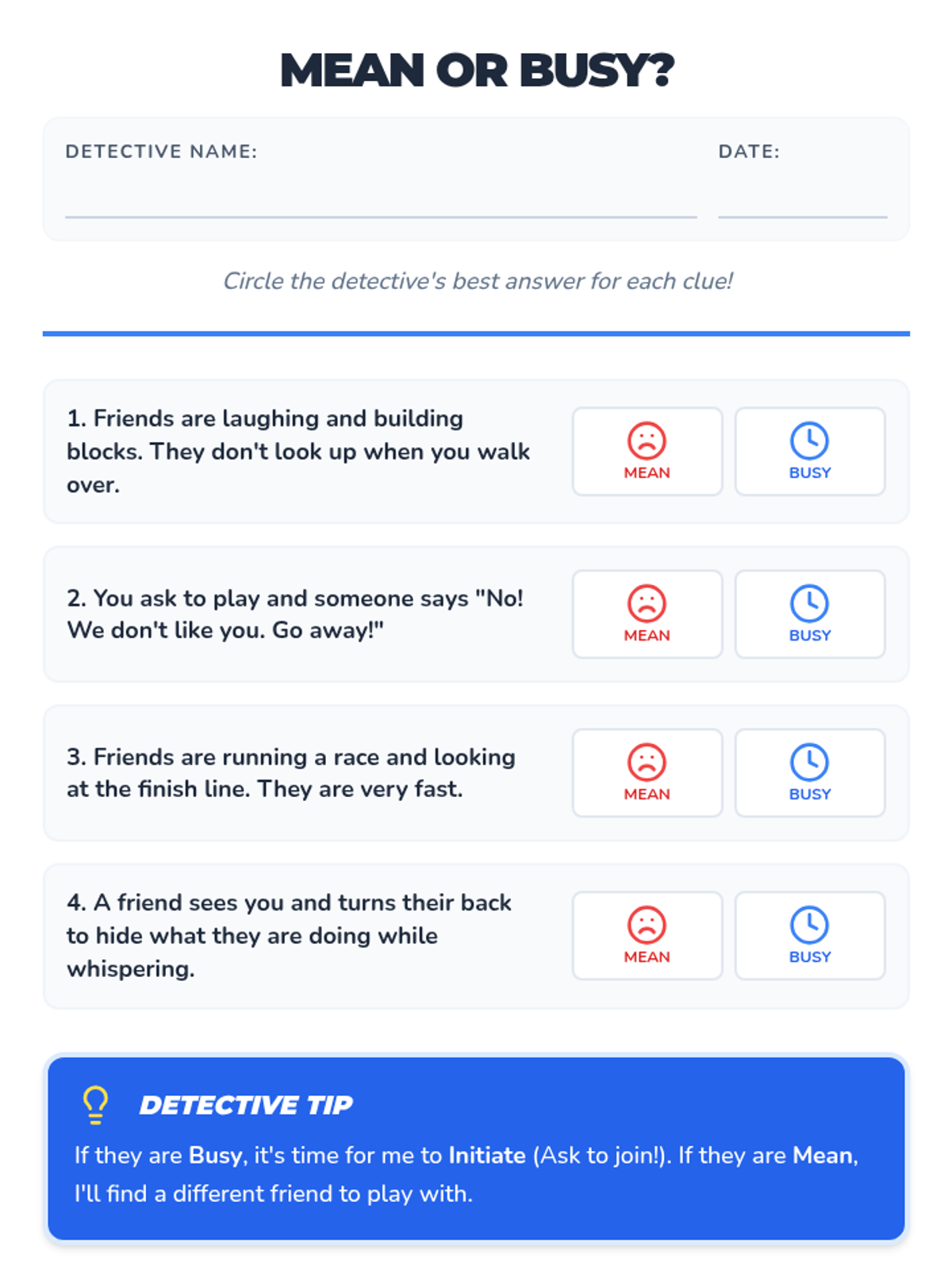 An updated visual slide deck including a flowchart summary and specific practice scenarios to help students differentiate between mean and busy behaviors.