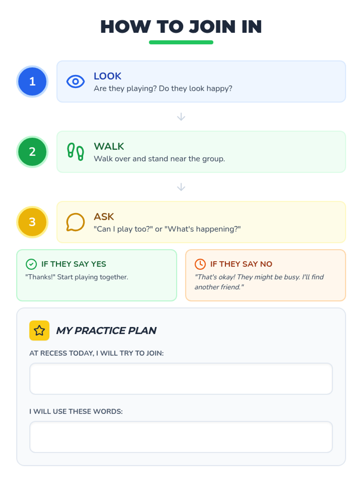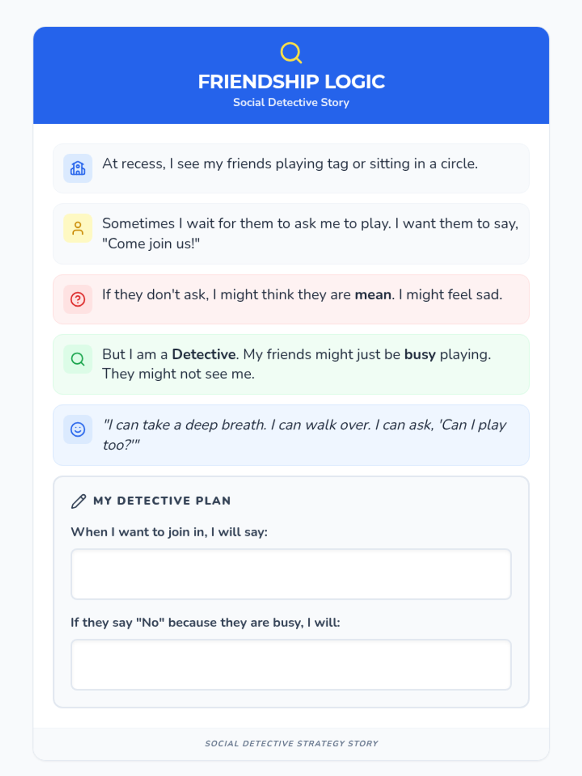 A condensed, single-page social story that explains the difference between feeling excluded and peers being busy, now including a reflection area for student planning.