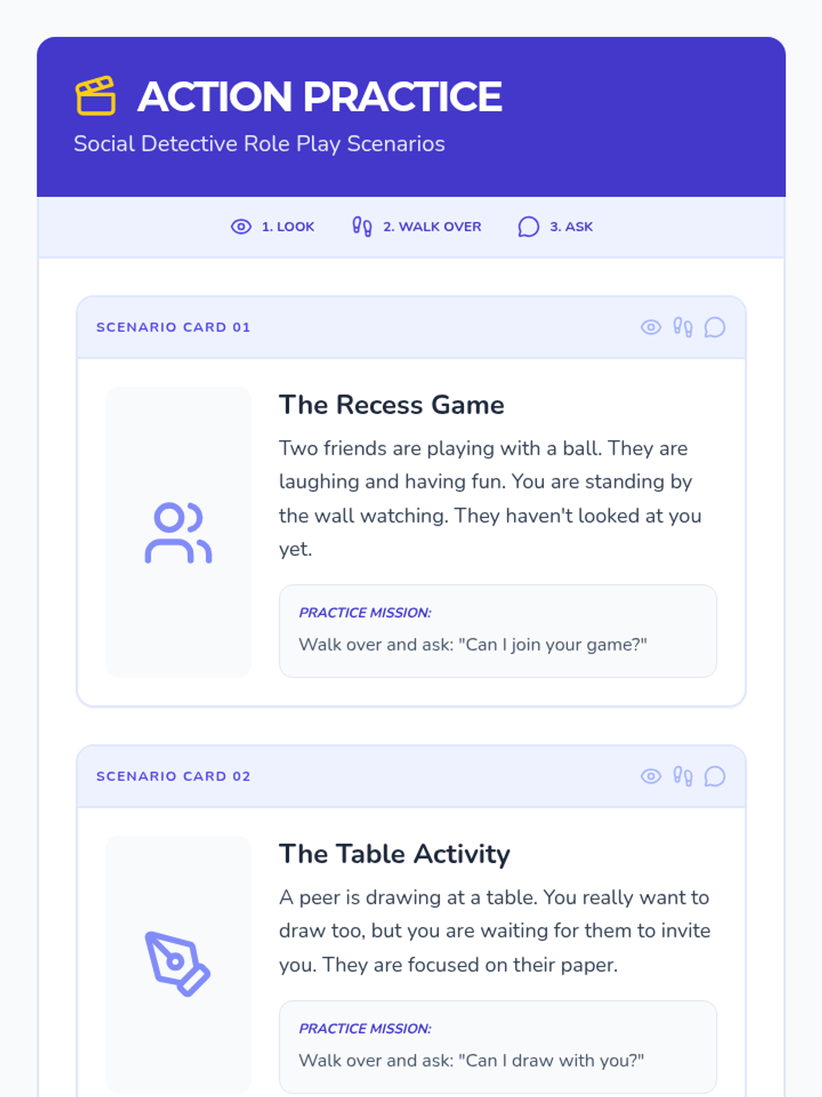 Improved role-play cards with visual icons for initiation steps and forced page breaks to ensure cards remain intact during printing.