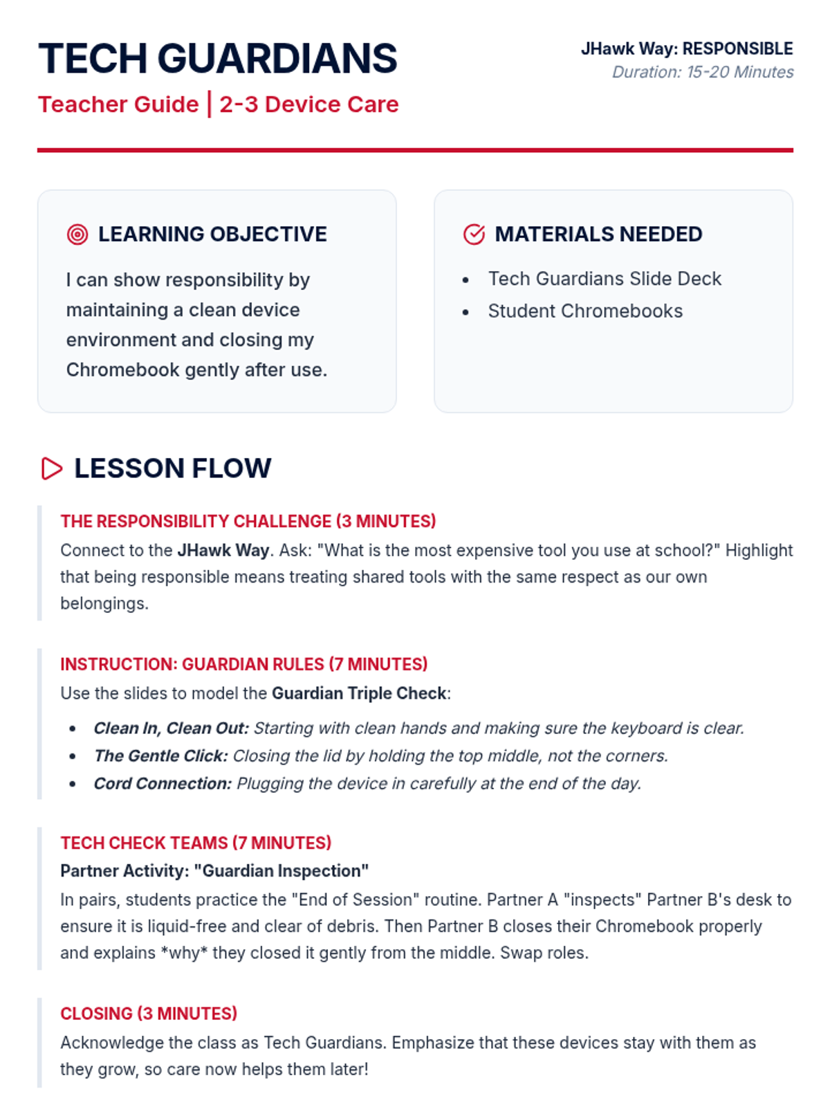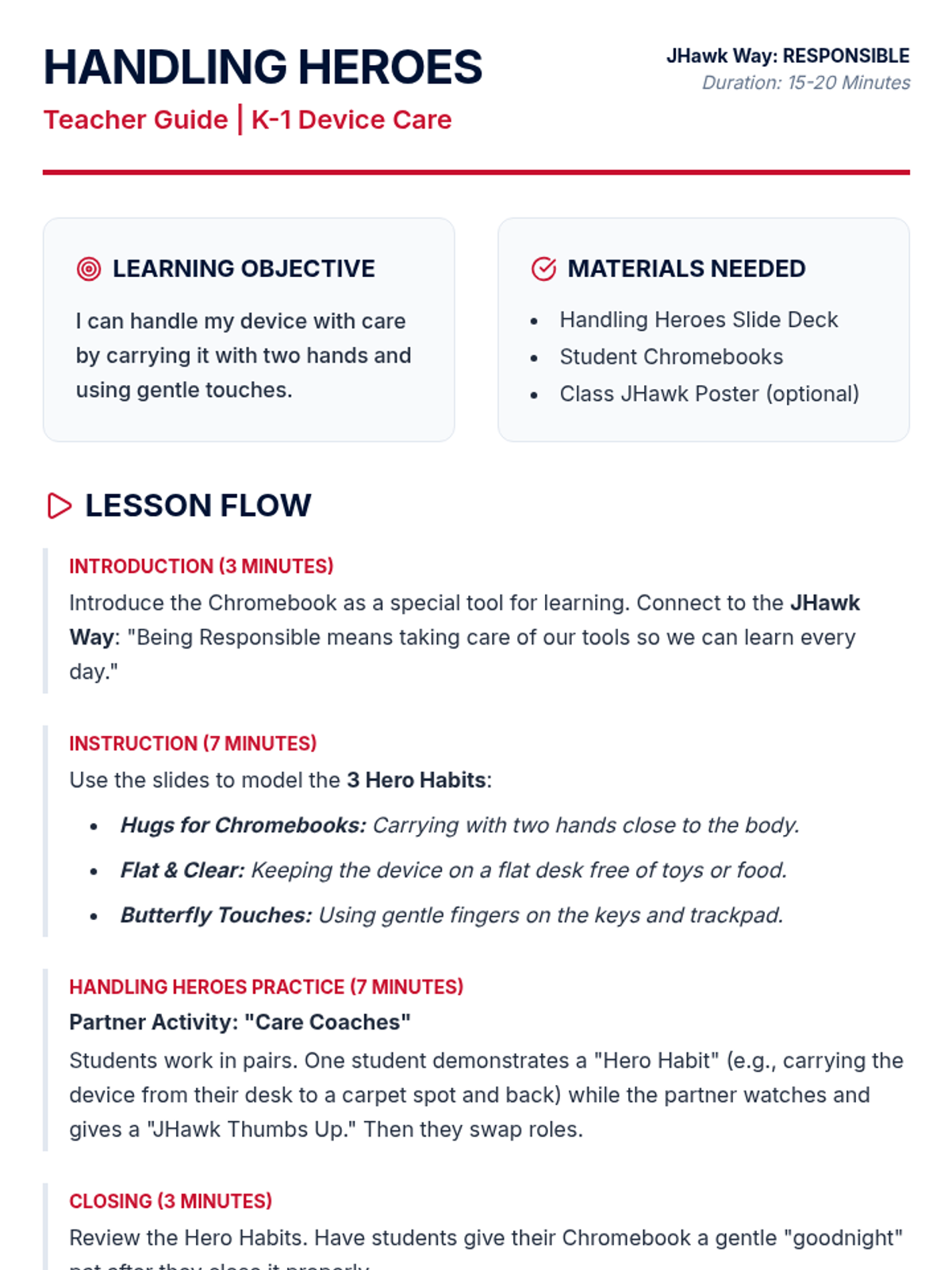 A teacher guide for K-1 students on Chromebook care, emphasizing carrying habits, gentle usage, and positive framing aligned with the JHawk Way. Fixes page break issues.