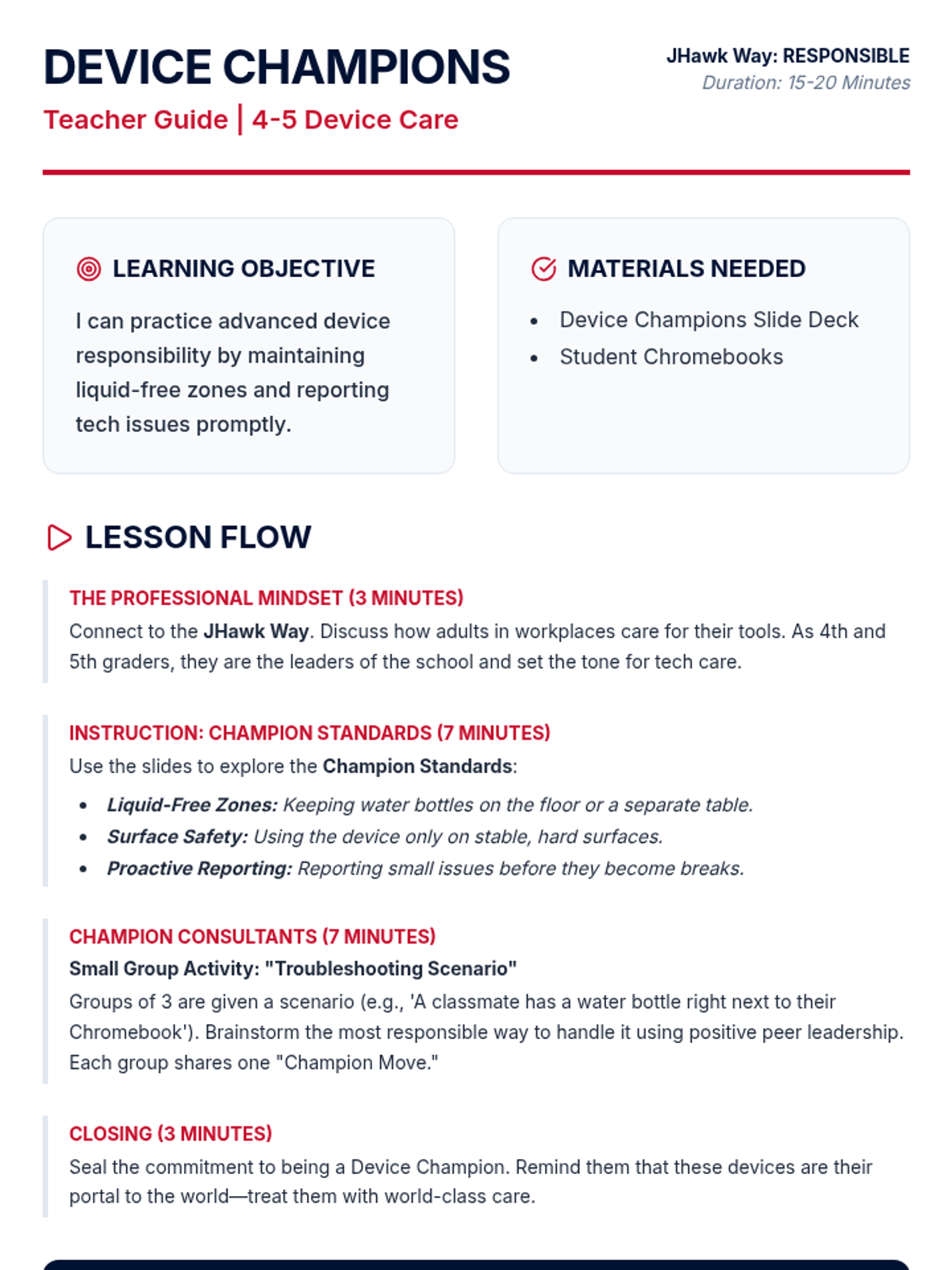 A teacher guide for 4-5th grade students on advanced device care. Fixes page break issues and ensures the collaborative activity and Support section flow correctly.