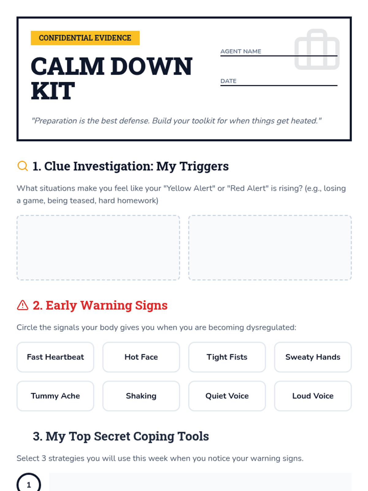 A student-facing worksheet for self-regulation planning. Students identify emotional triggers, physical warning signs, and select personal coping strategies to build their own 'Calm Down Kit'.