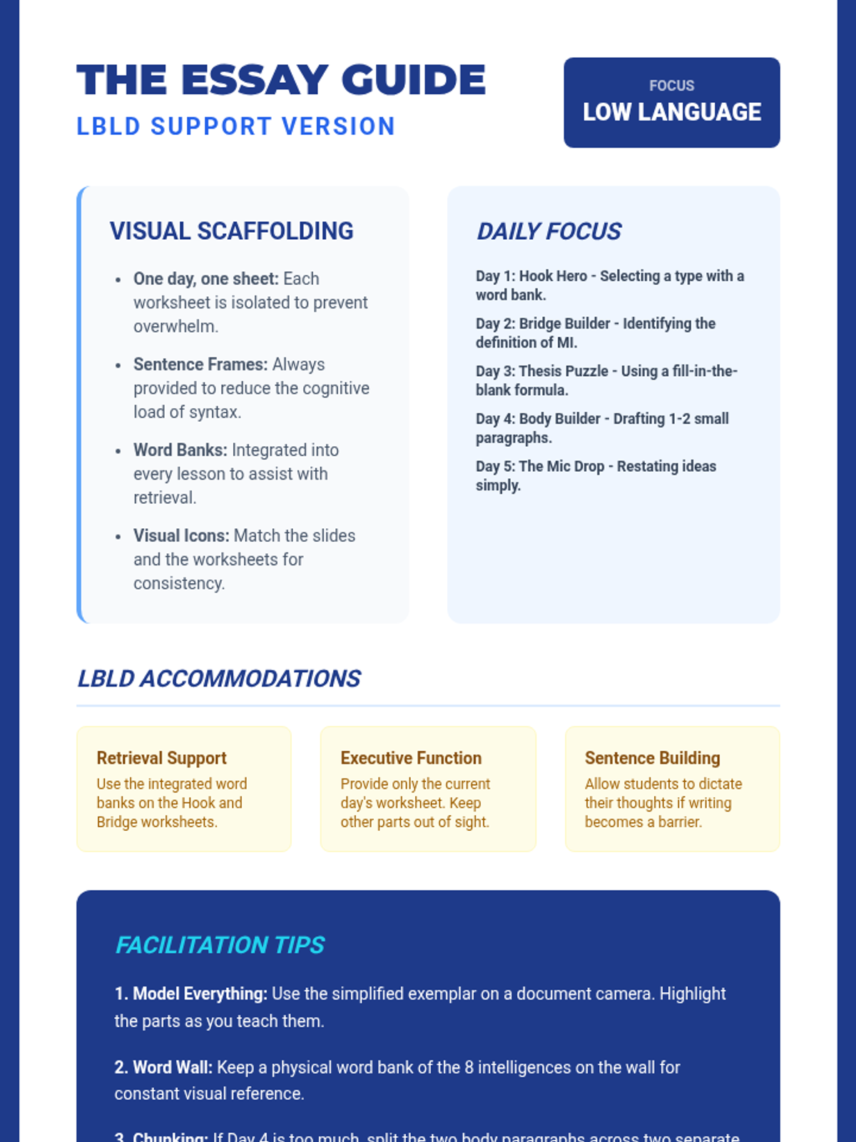 An adapted facilitator's guide for teaching students with language-based learning disabilities, focusing on visual scaffolding, chunking, and reduced text density.