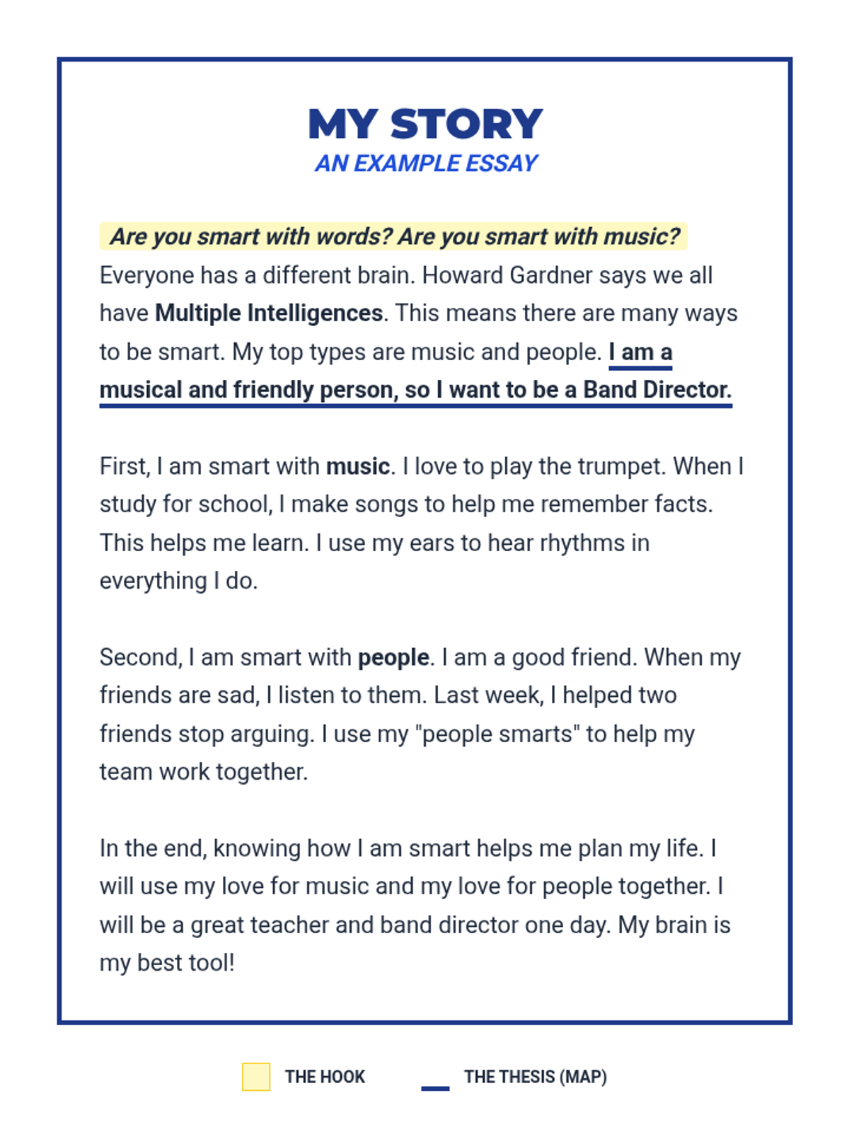 A simplified exemplar essay with reduced language and clear visual markers, designed for students with language-based learning disabilities.