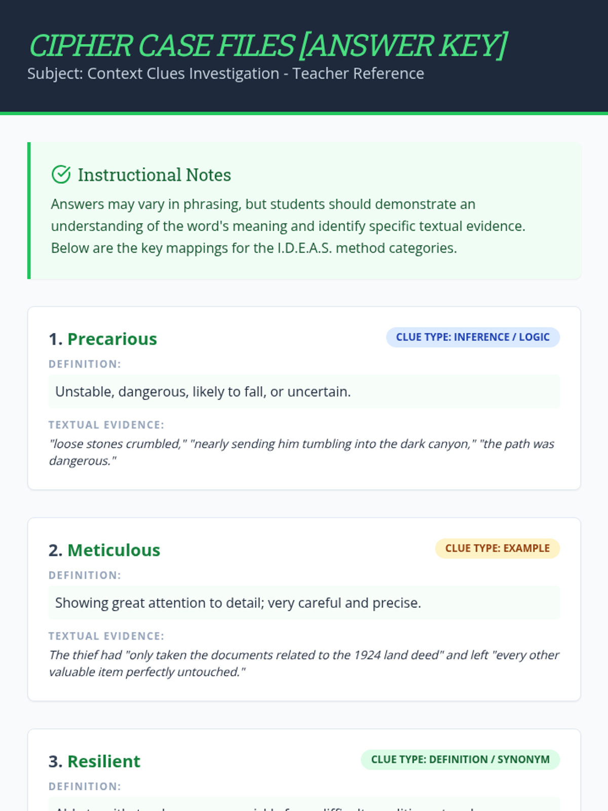 A comprehensive answer key for the Cipher Case Worksheet. It includes detailed mappings for context clue types (Inference, Example, Synonym, etc.) to assist teachers in grading student responses according to the I.D.E.A.S. method.