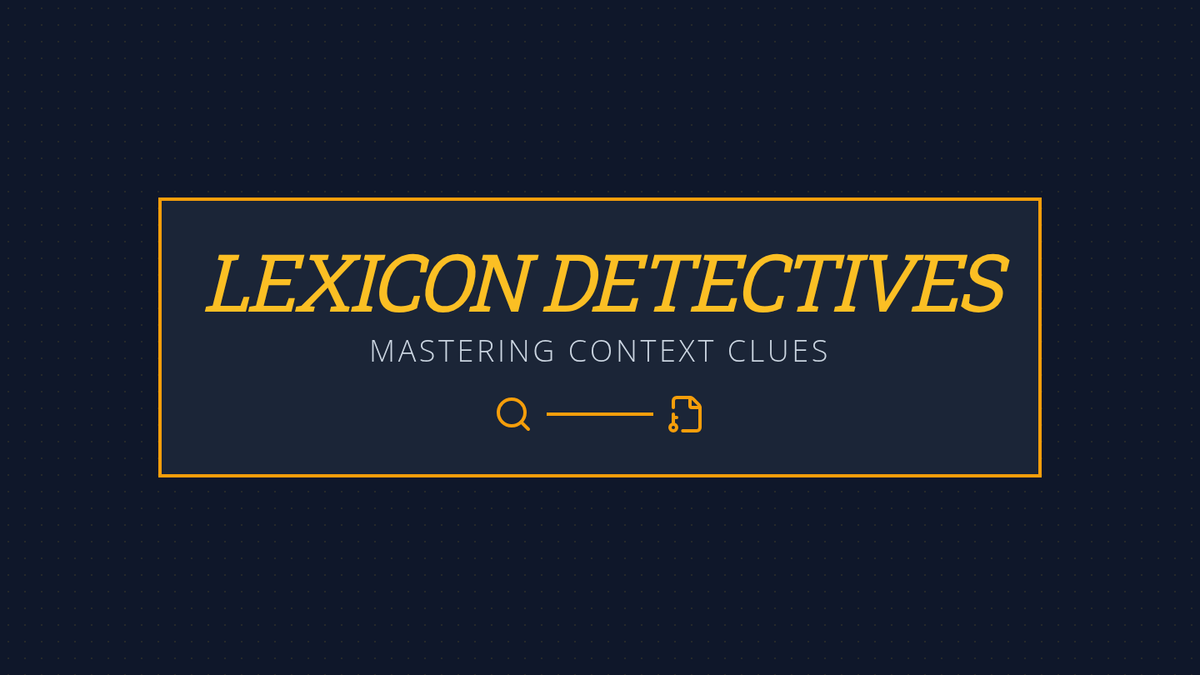 An introductory presentation for the Lexicon Detectives lesson. It introduces the I.D.E.A.S. method (Inference, Definition, Example, Antonym, Synonym) for identifying context clues with clear, high-contrast examples and a detective theme.