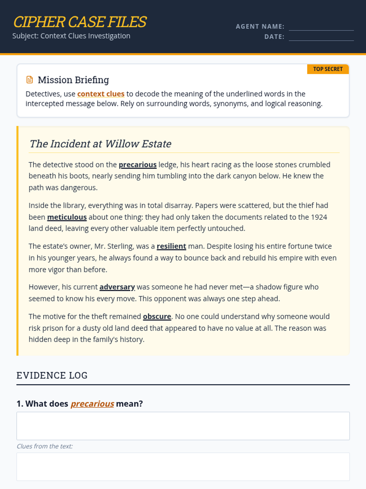 A detective-themed context clues worksheet featuring a short mystery passage. Students analyze five challenging vocabulary words, providing definitions and identifying specific textual evidence used to decode their meanings. This version includes optimized page breaks and space allocation.
