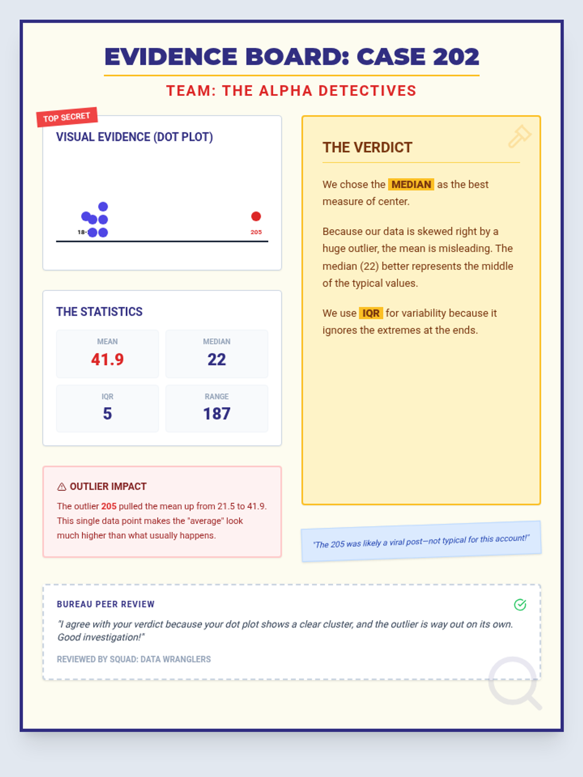 A visual example and mockup of a completed 'Evidence Board' poster for Case 202, demonstrating how students should present their visual plot, statistics, verdict, and outlier analysis. Revised for single-page layout.