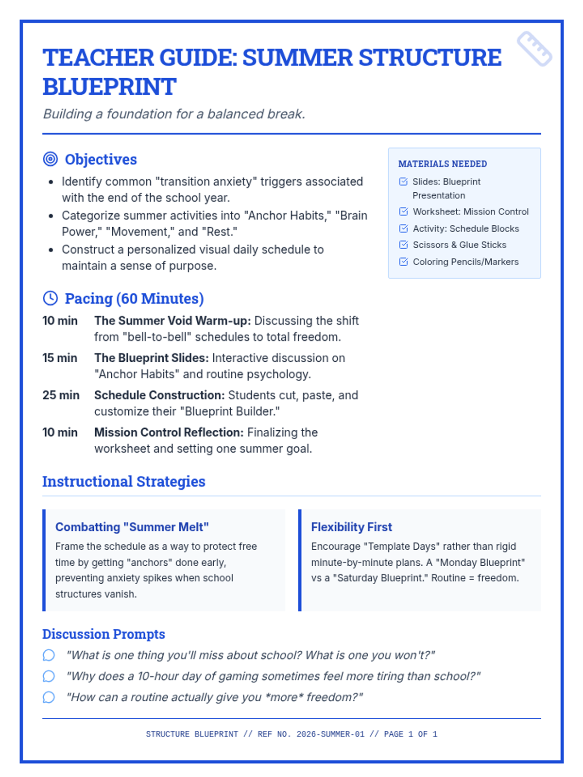 A comprehensive teacher guide for the Summer Structure Blueprint lesson, outlining objectives, pacing, and instructional strategies for helping students build a balanced summer routine.