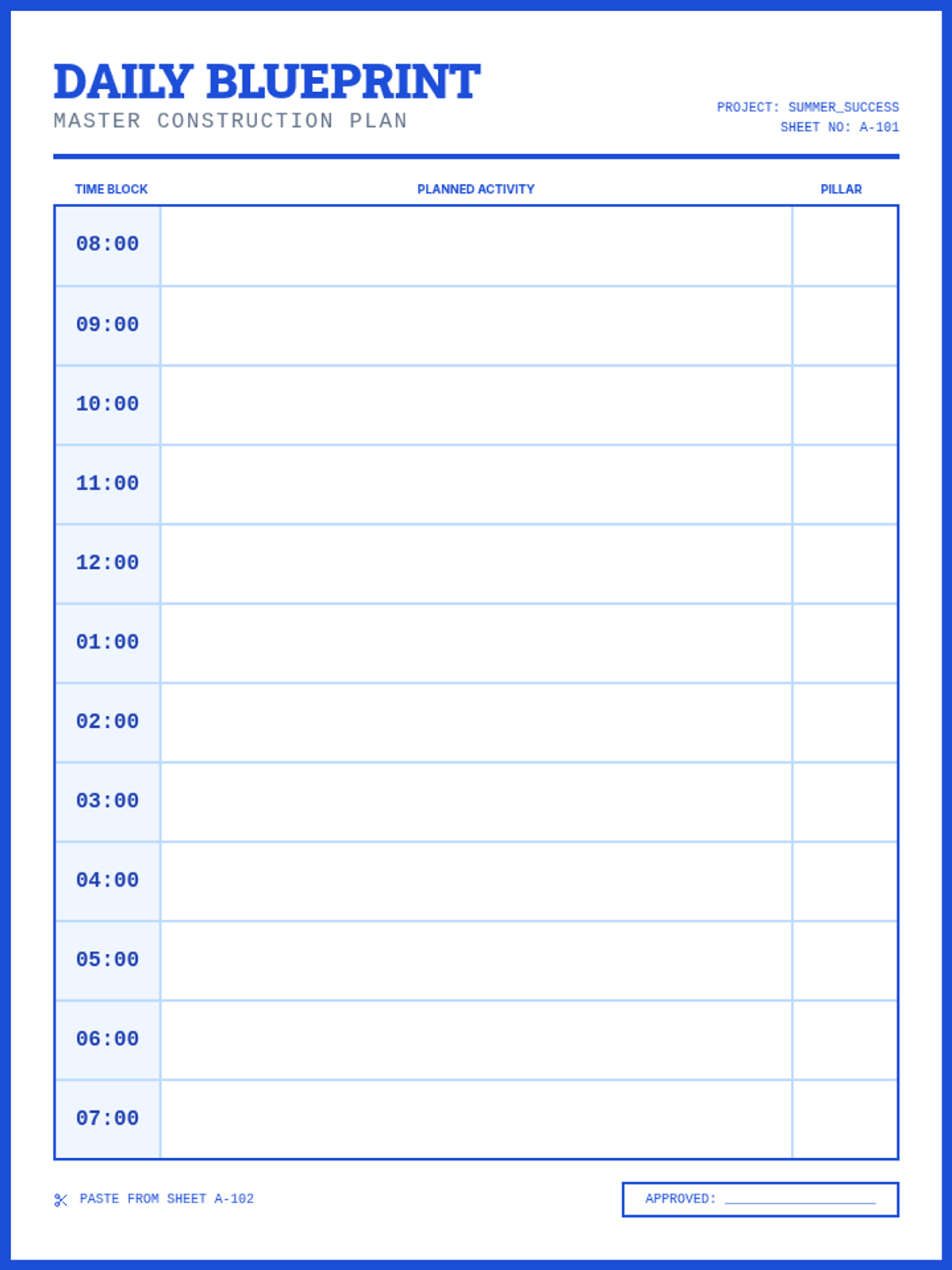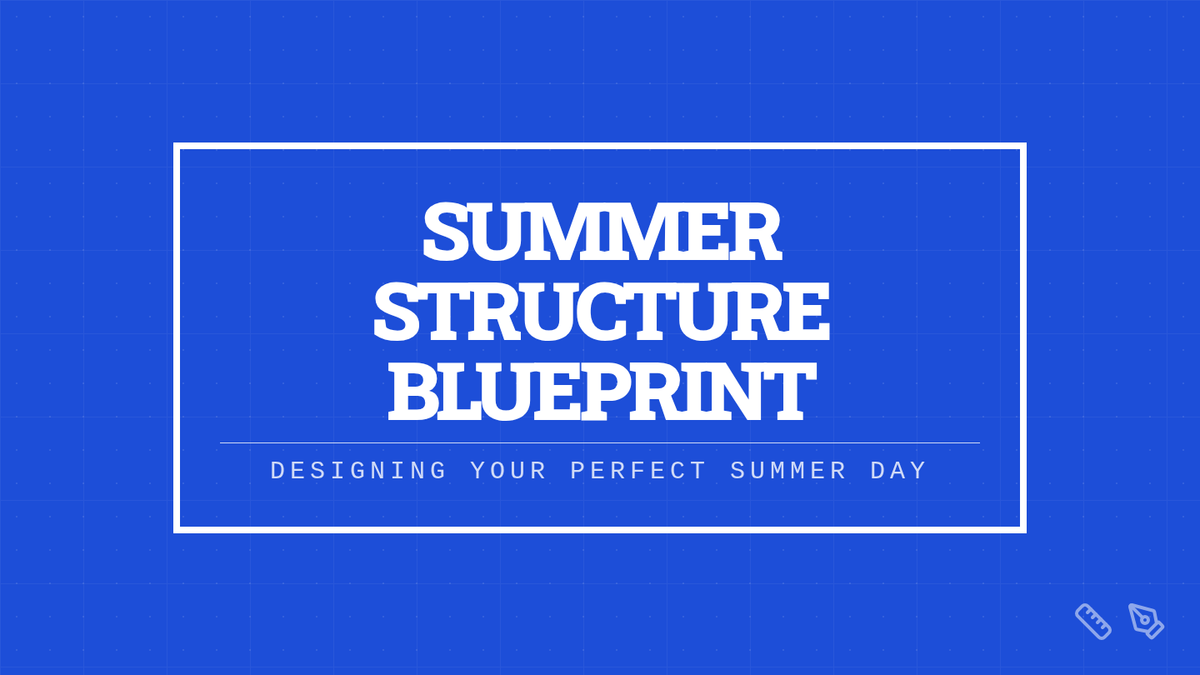 An engaging instructional slide deck for the Summer Structure Blueprint lesson, using a technical blueprint aesthetic to explain the importance of routines and the "4 Pillars" of a balanced summer day.