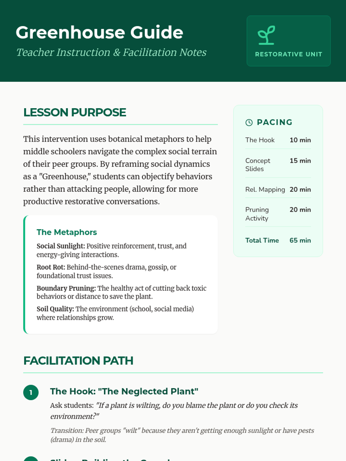 A comprehensive teacher facilitation guide for the Connection Greenhouse lesson, detailing metaphors, pacing, and discussion prompts for a restorative social-emotional intervention.