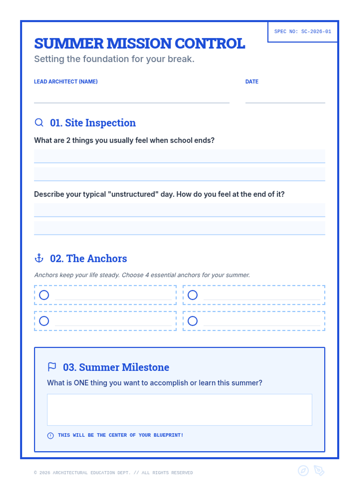 A student reflection worksheet that helps identify transition anxiety triggers, establish daily 'Anchor Habits', and set a primary summer milestone as part of their personal blueprint.