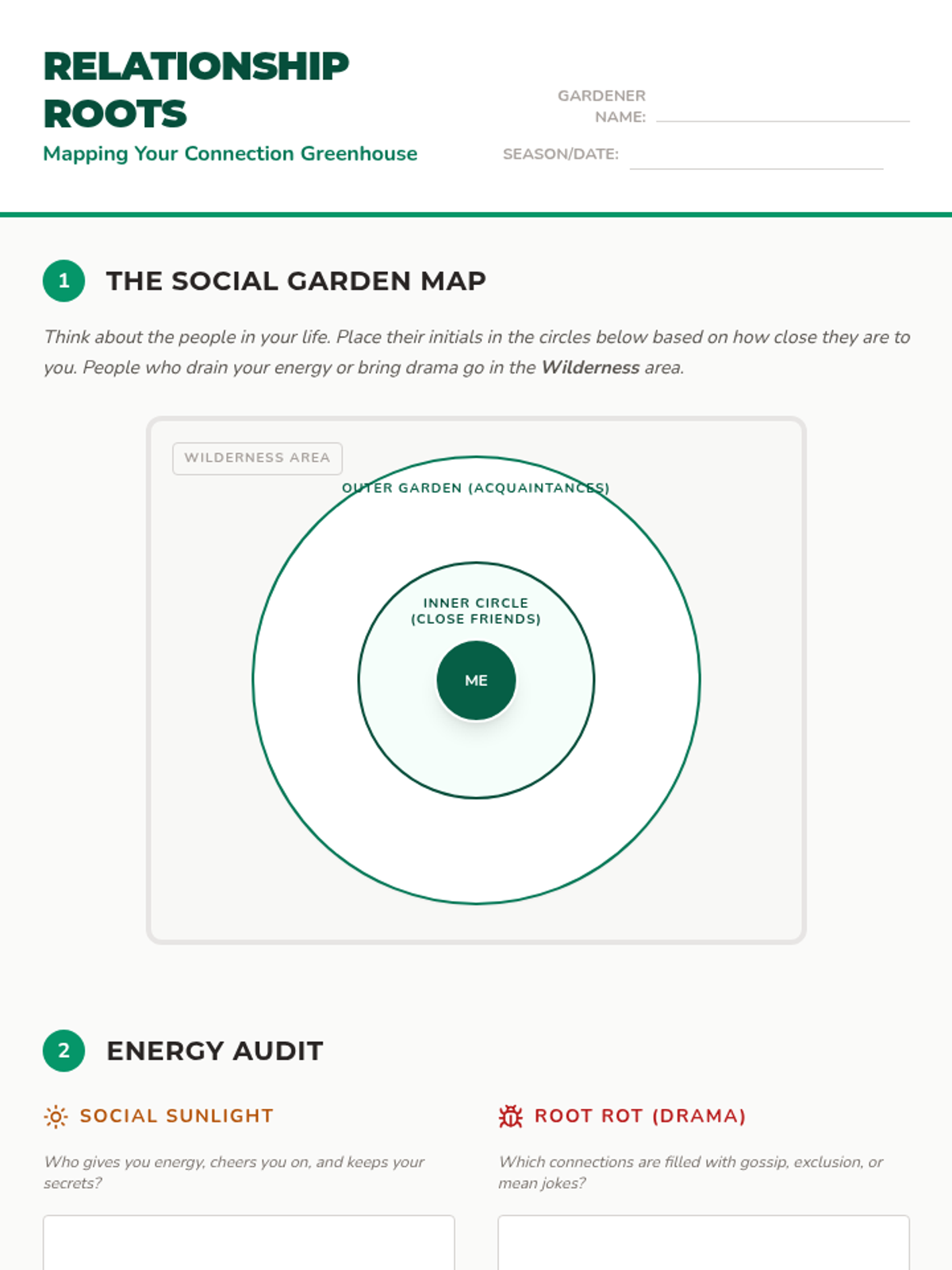 A student worksheet for mapping peer relationships, auditing social energy, and planning healthy boundaries using the greenhouse metaphor.