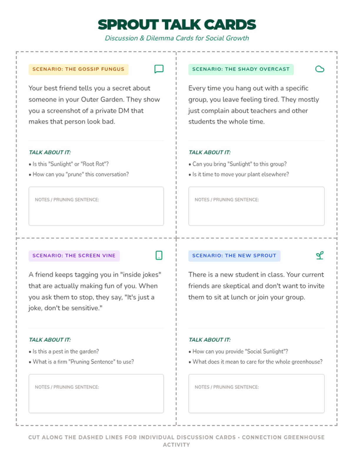 A set of discussion cards featuring social scenarios and dilemmas that help students practice applying greenhouse metaphors to real-life peer situations. Includes cut-line guides and note-taking areas.