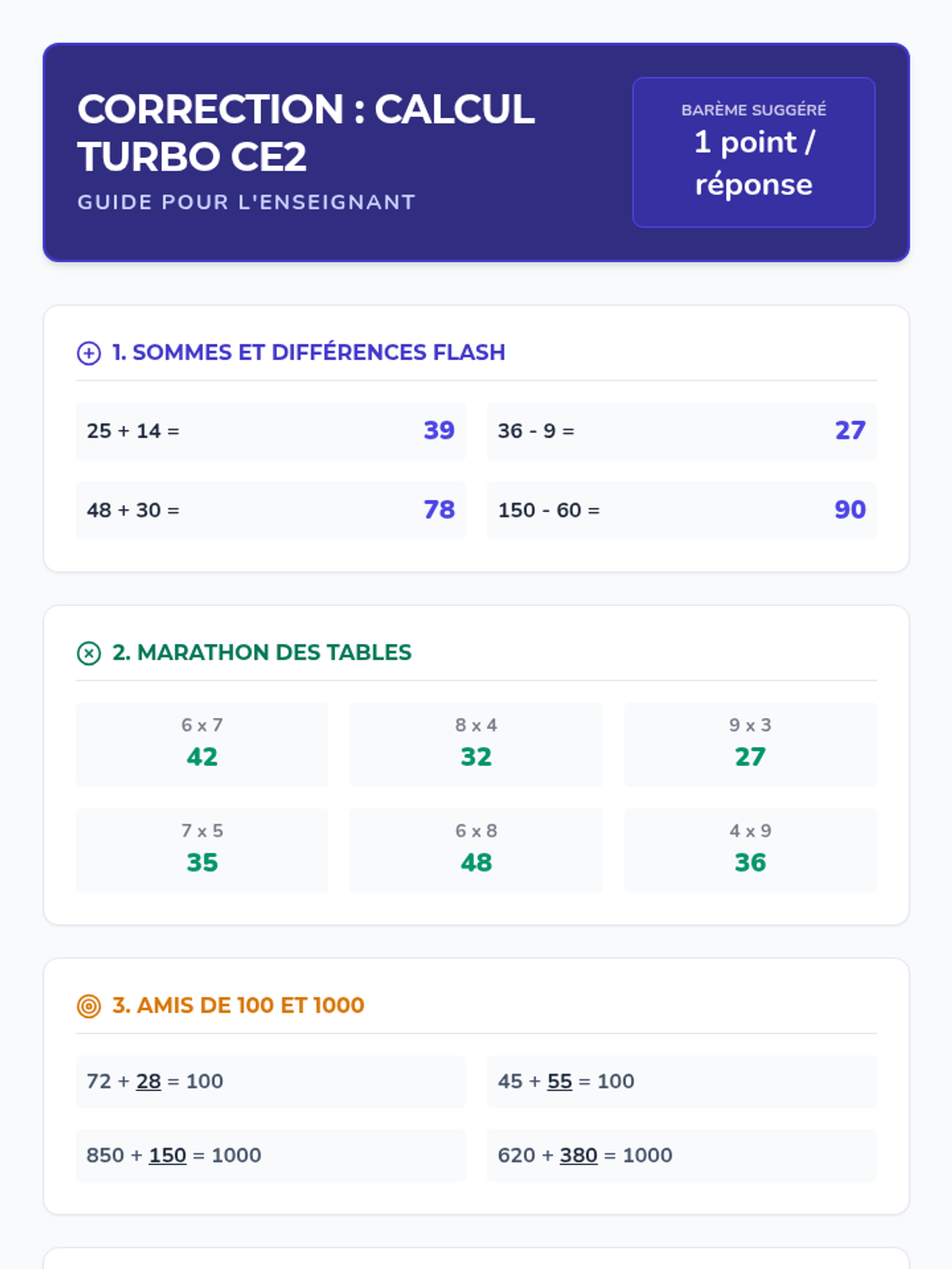 Le corrigé détaillé pour l'enseignant de l'évaluation Calcul Turbo CE2. Comprend les réponses attendues et une suggestion de barème pour une correction rapide et efficace. Comprend également des classes de rupture de page pour une impression optimale.