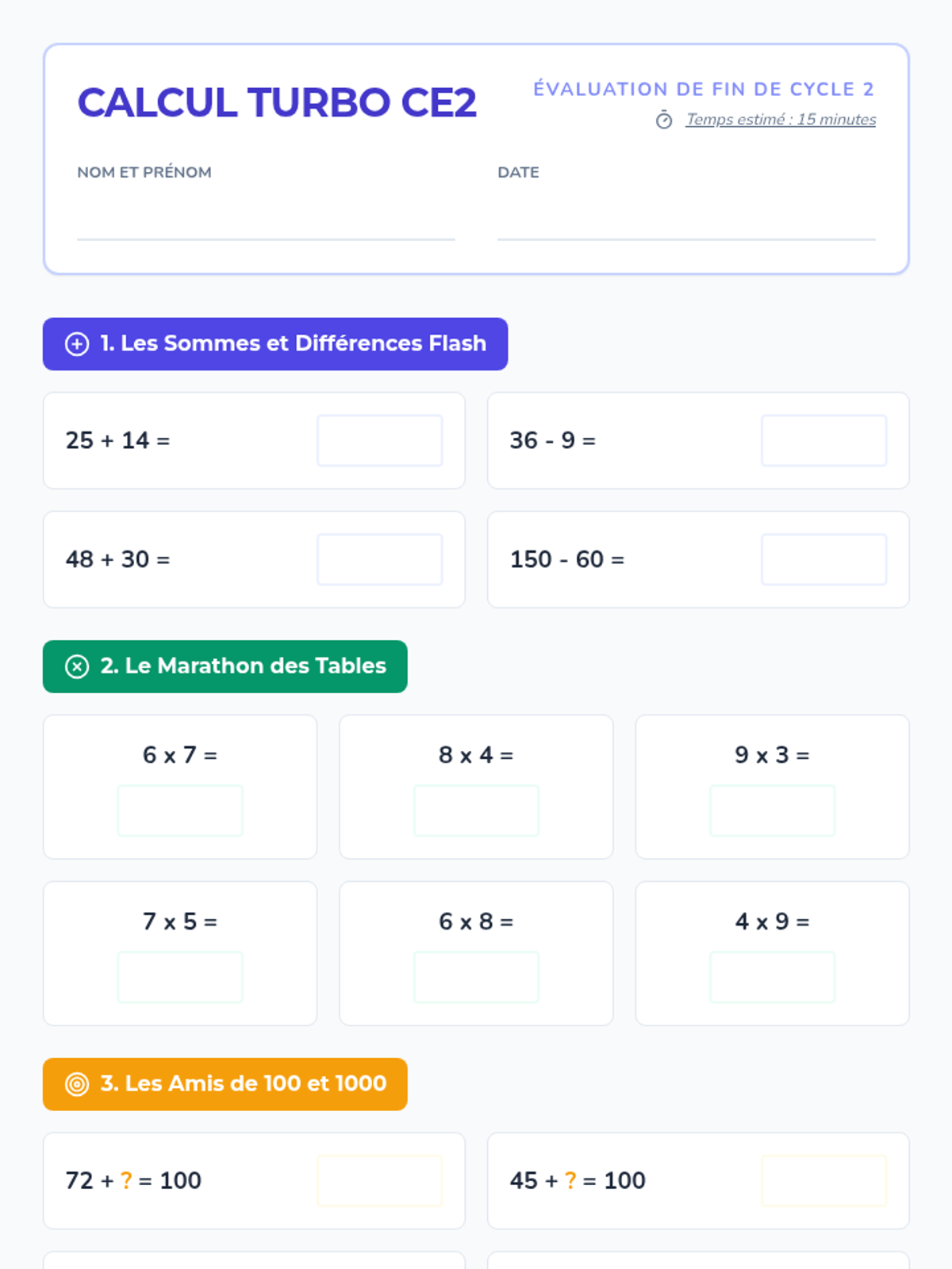Une évaluation complète de calcul mental pour le niveau CE2 (fin de cycle 2) couvrant les additions, soustractions, tables de multiplication, compléments, doubles/moitiés et multiplications par 10/100. Format quiz rapide avec zones de réponse claires. Mise à jour avec corrections de mise en page.