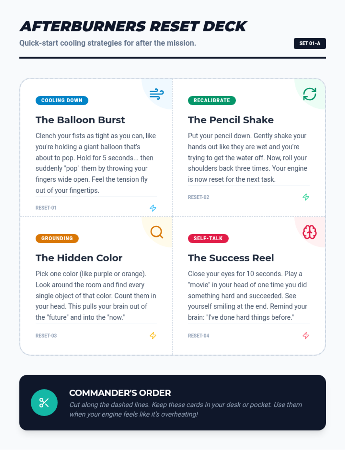 A set of printable task cards featuring four quick 'reset' activities. Revised for consistent card footers and clear dashed cut lines.