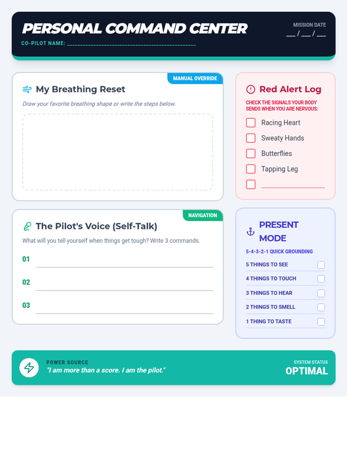 A student-facing worksheet titled 'Personal Command Center' that allows 3rd-5th graders to map out their unique coping strategies. Revised to ensure all content fits on one page and the grounding section is legible for writing.
