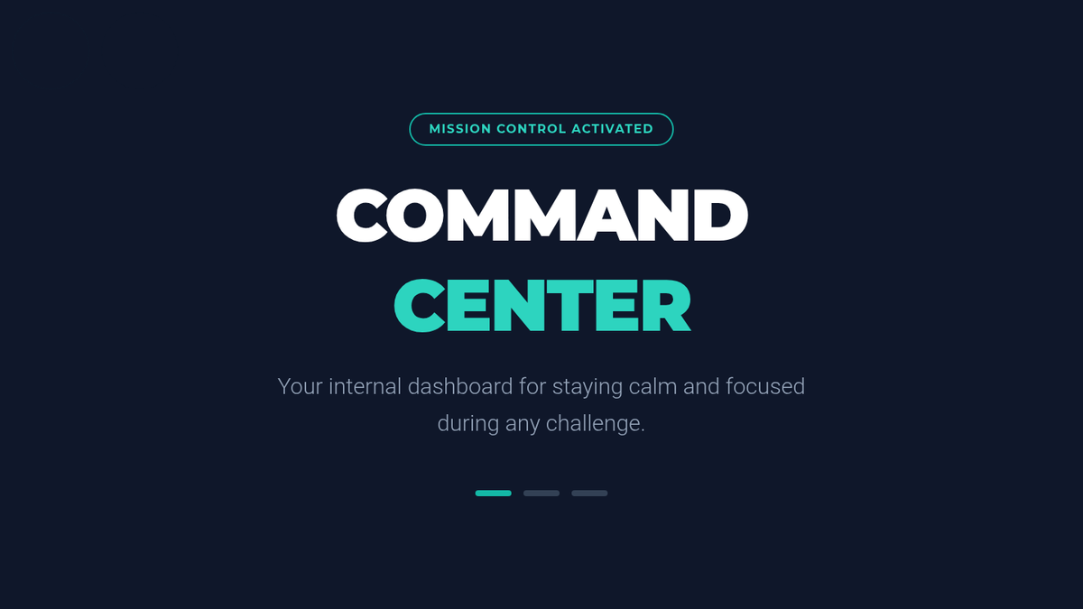 A high-tech, mission-control themed slide deck for the Testing Calm Command Center workshop, using a pilot metaphor to teach self-regulation and grounding techniques to students.