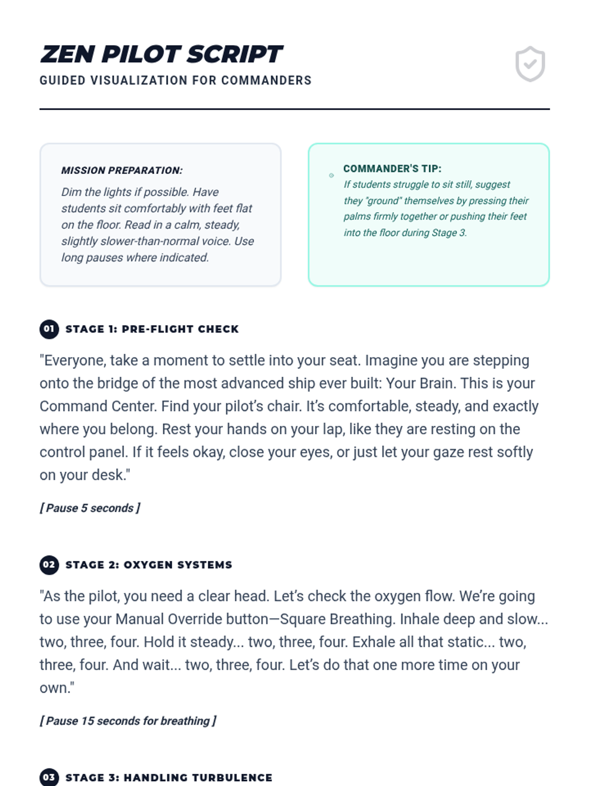 A guided imagery and meditation script for teachers. Revised to ensure section headers are legible in low light and content does not split awkwardly across pages.