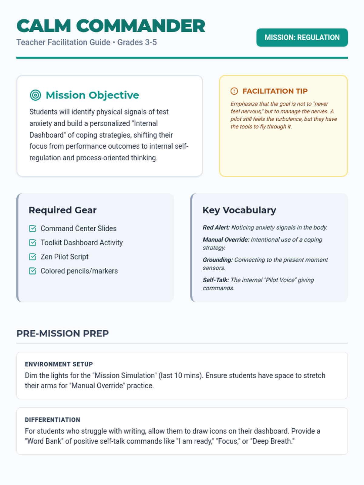 A facilitator's guide for the Testing Calm Command Center workshop, featuring a clear mission protocol, key vocabulary, and debriefing questions for 3rd-5th grade teachers. Updated for better page-break consistency and visual flow.