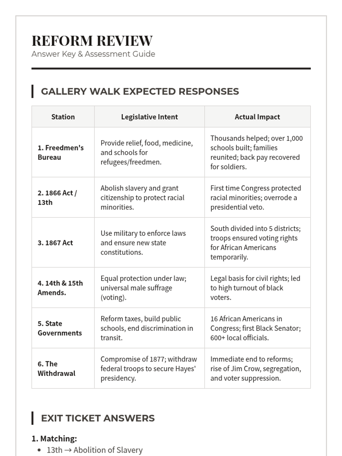 A comprehensive answer key and assessment guide for the Reconstruction lesson, including expected gallery walk responses and exit ticket solutions.
