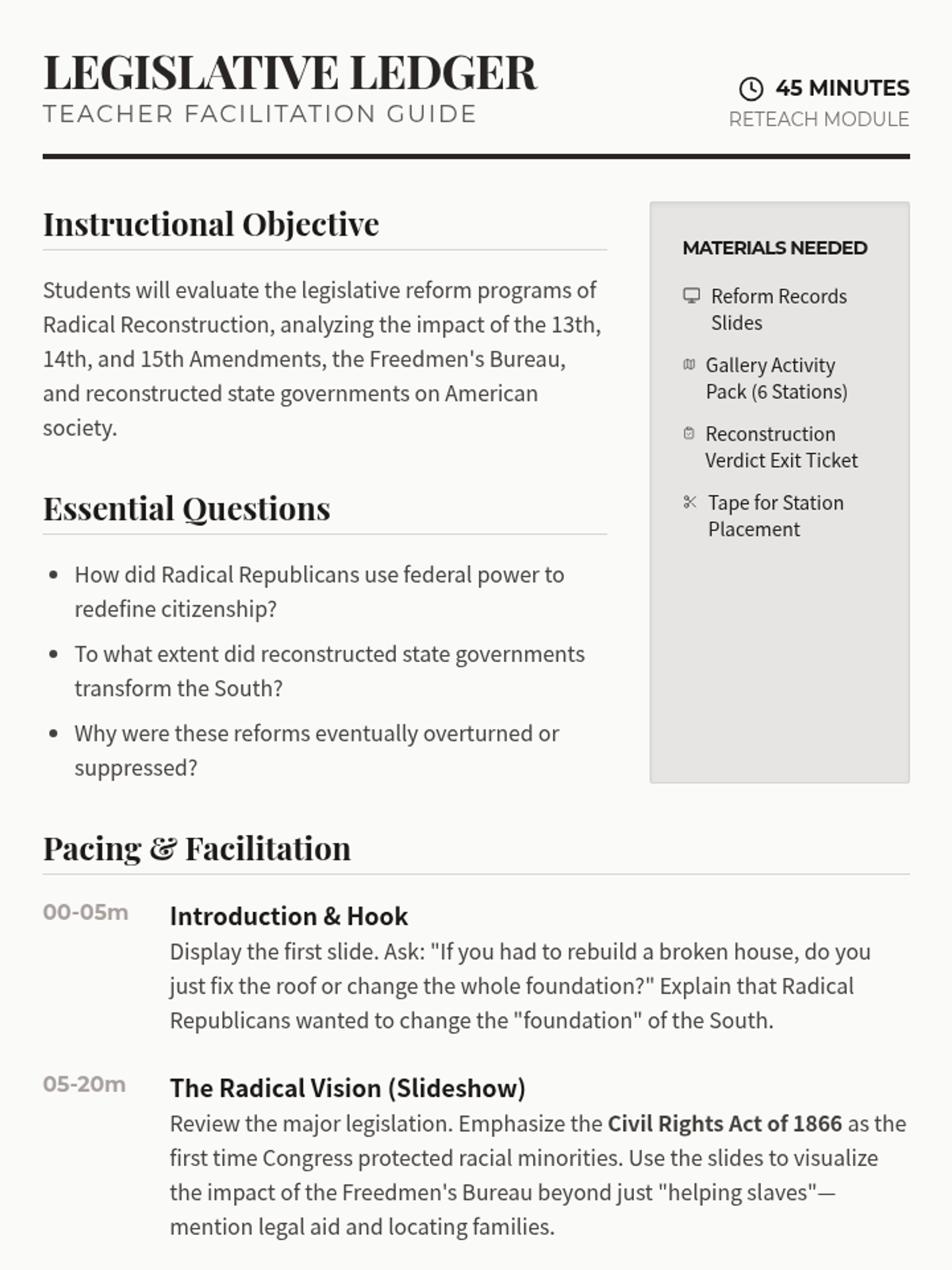 A comprehensive teacher facilitation guide for a 45-minute reteach lesson on Radical Reconstruction reforms, including pacing, essential questions, and instructional tips.