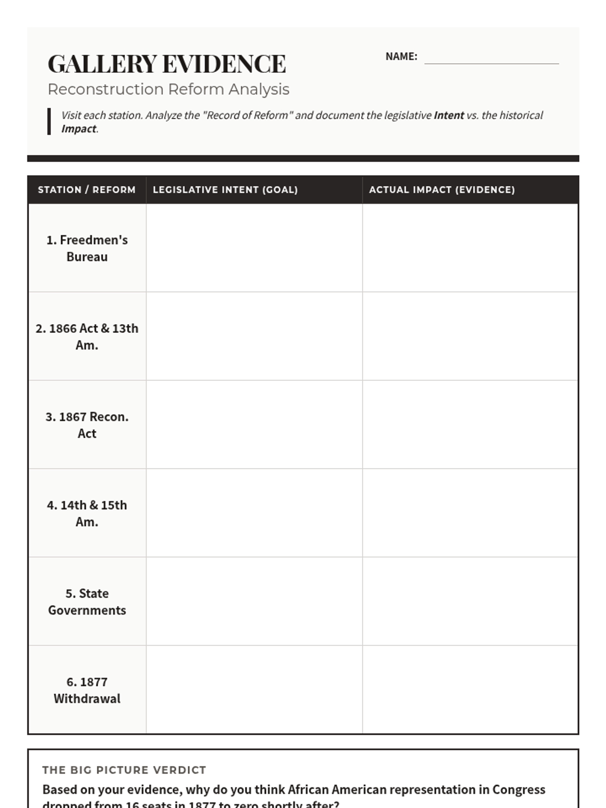 A student-facing graphic organizer for the Gallery Walk activity, including a structured analysis table and six printable station cards containing specific evidence about Reconstruction reforms.