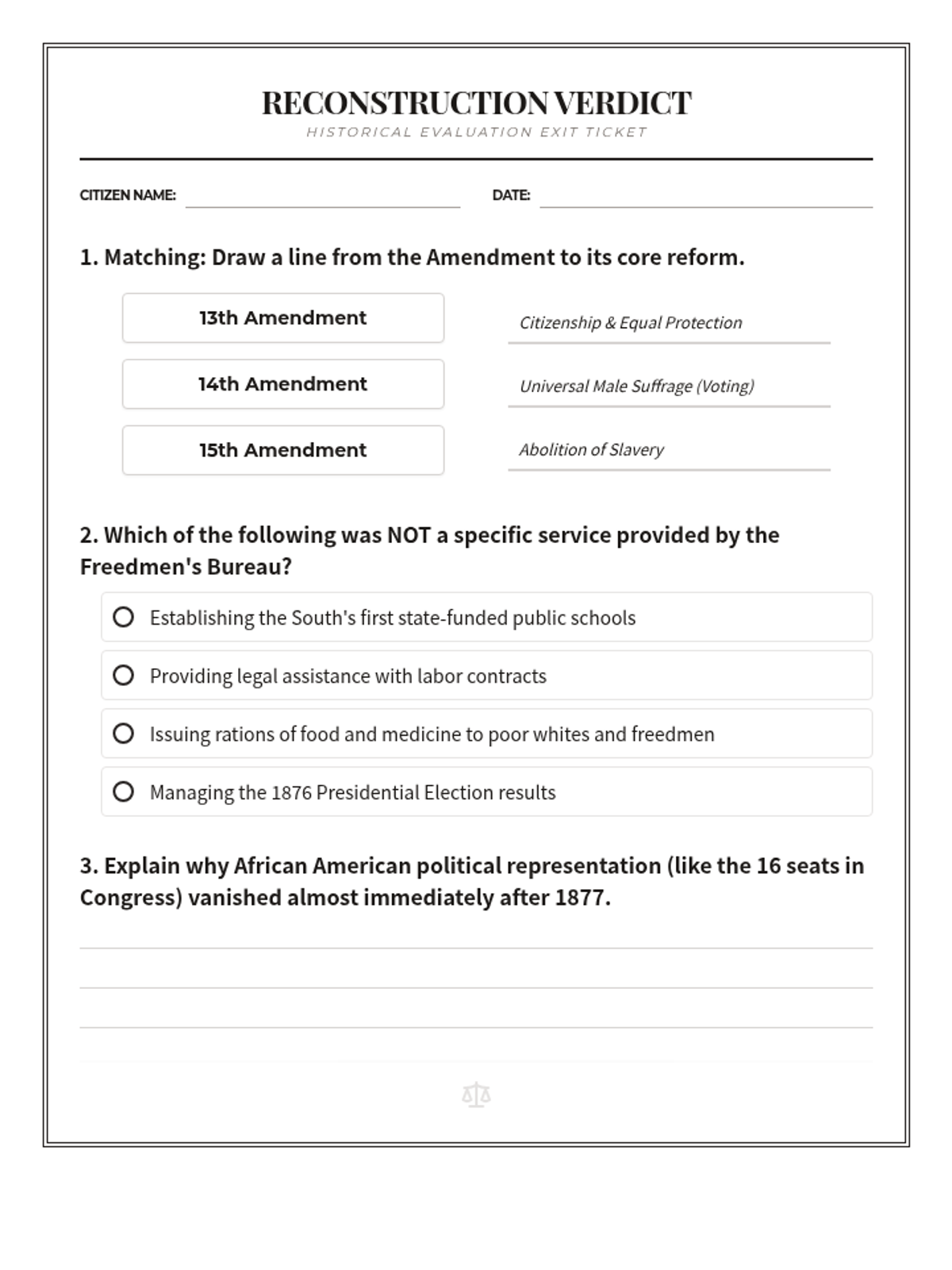 A concise assessment for the end of the Reconstruction lesson, featuring matching, multiple choice, and short response questions to gauge student understanding of legislative reforms.