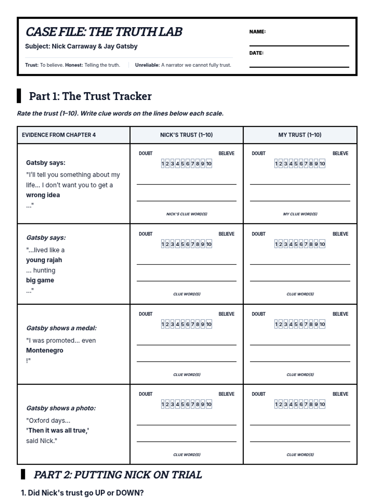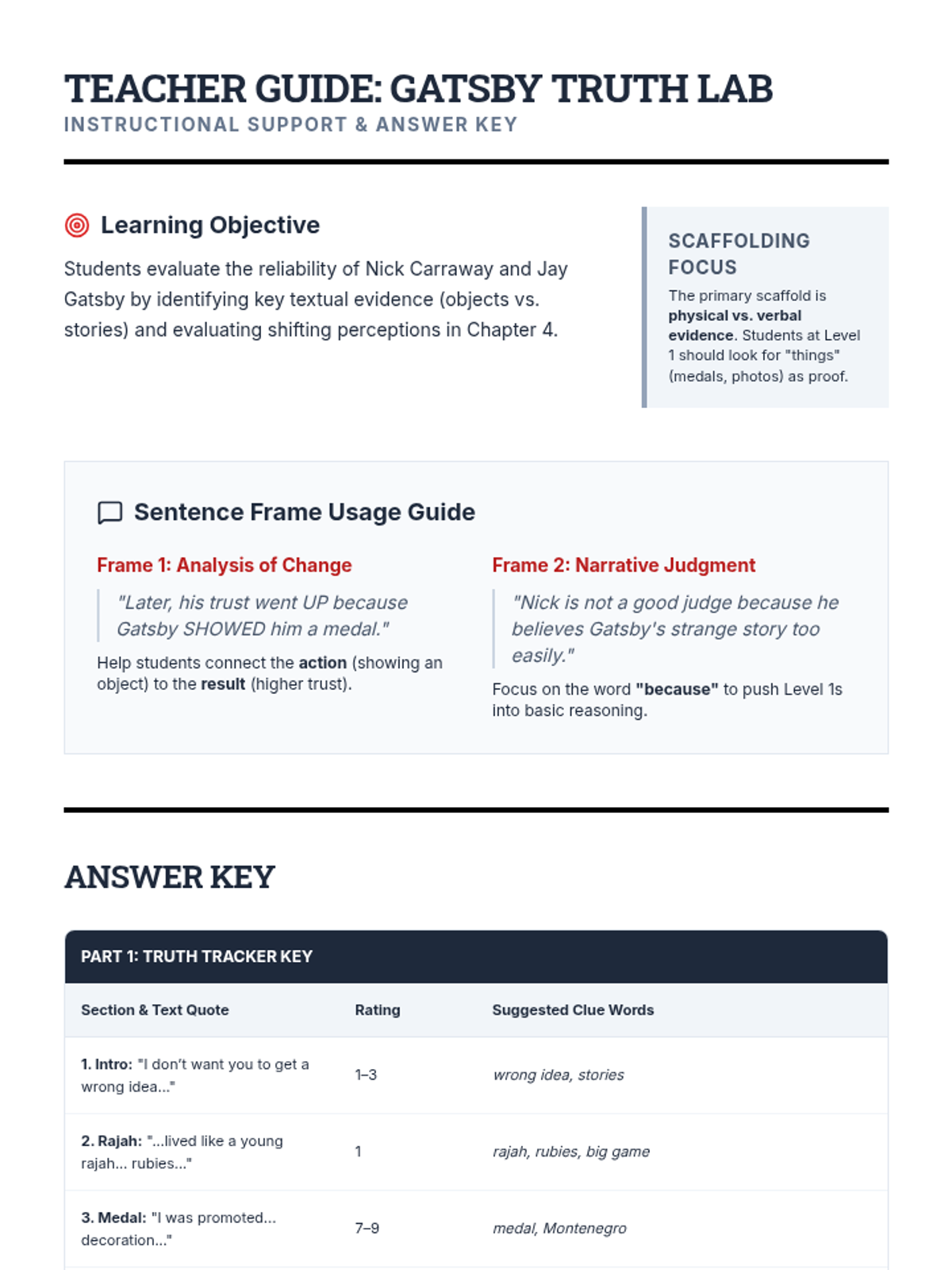 A teacher facilitation guide and answer key for the Gatsby Truth Tracker lesson. Includes ELL Level 1 specific strategies, suggested trust ratings for the worksheet sections, and a dedicated sentence frame guide. Updated to include answer key for new question.